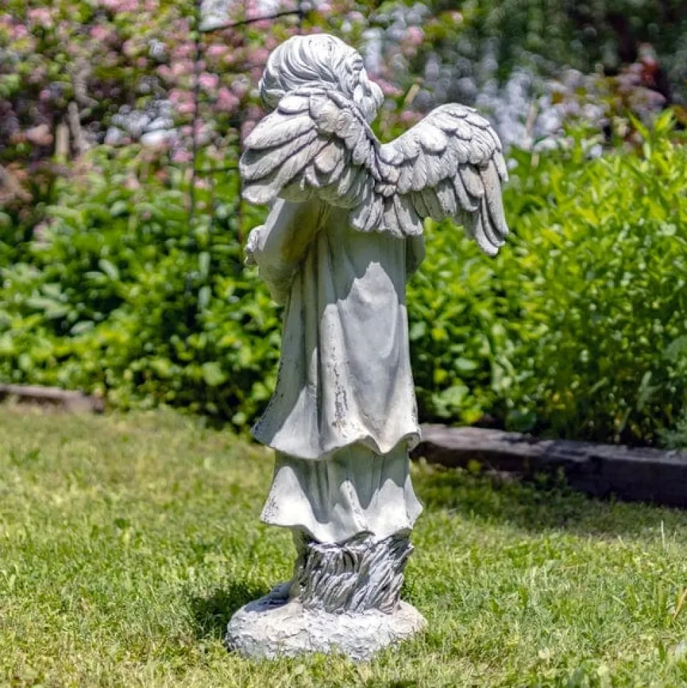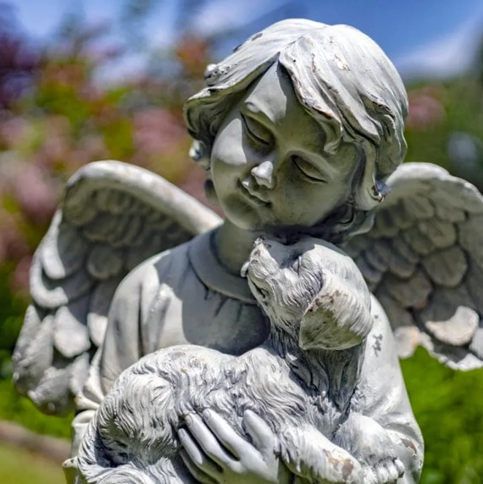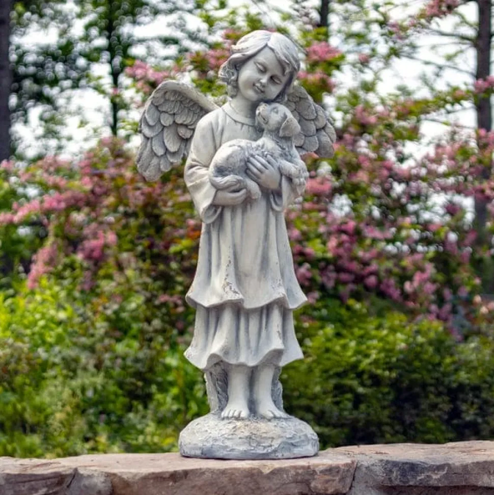 This stunning 39 inch tall angel statue, made from durable magnesium, features intricate details and a classic antique white finish. The serene angel holds a charming dog, making it a perfect addition to any garden or outdoor space. Grace your home with this elegant piece of art.