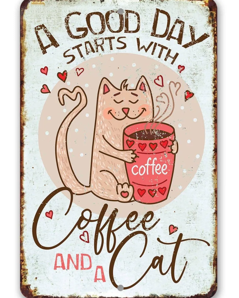A Good Day Starts With Coffee and a Cat, of course! For our feline fanatics, we have this funny, high quality, made in the USA metal sign that is easy to hang anywhere it will get the most smiles. Perfect gift for the cat and coffee lovers!
