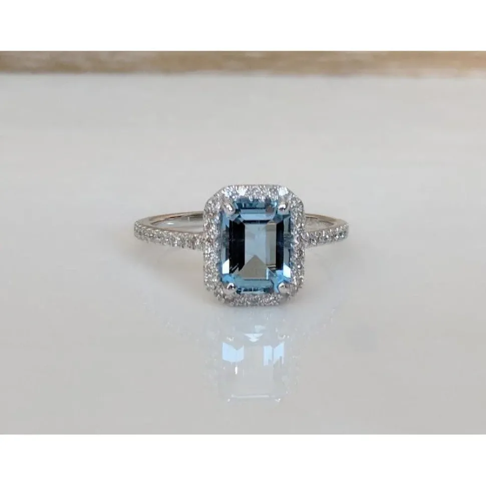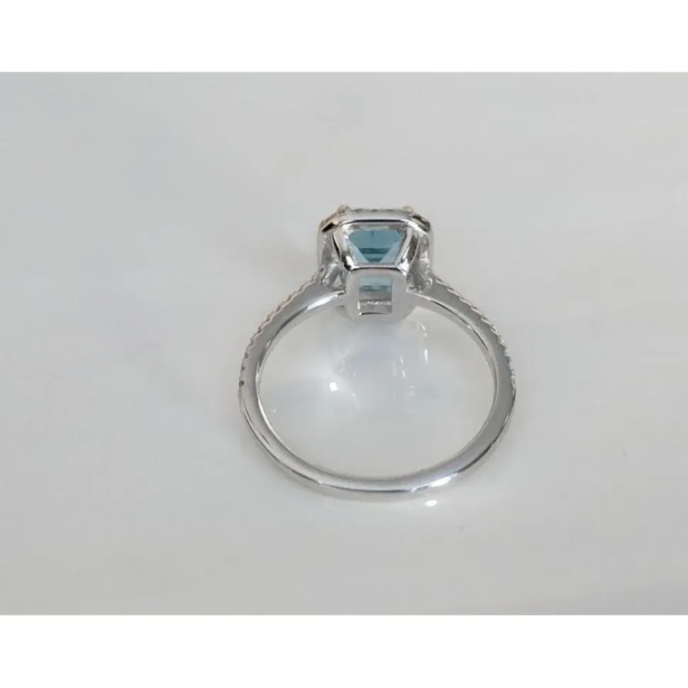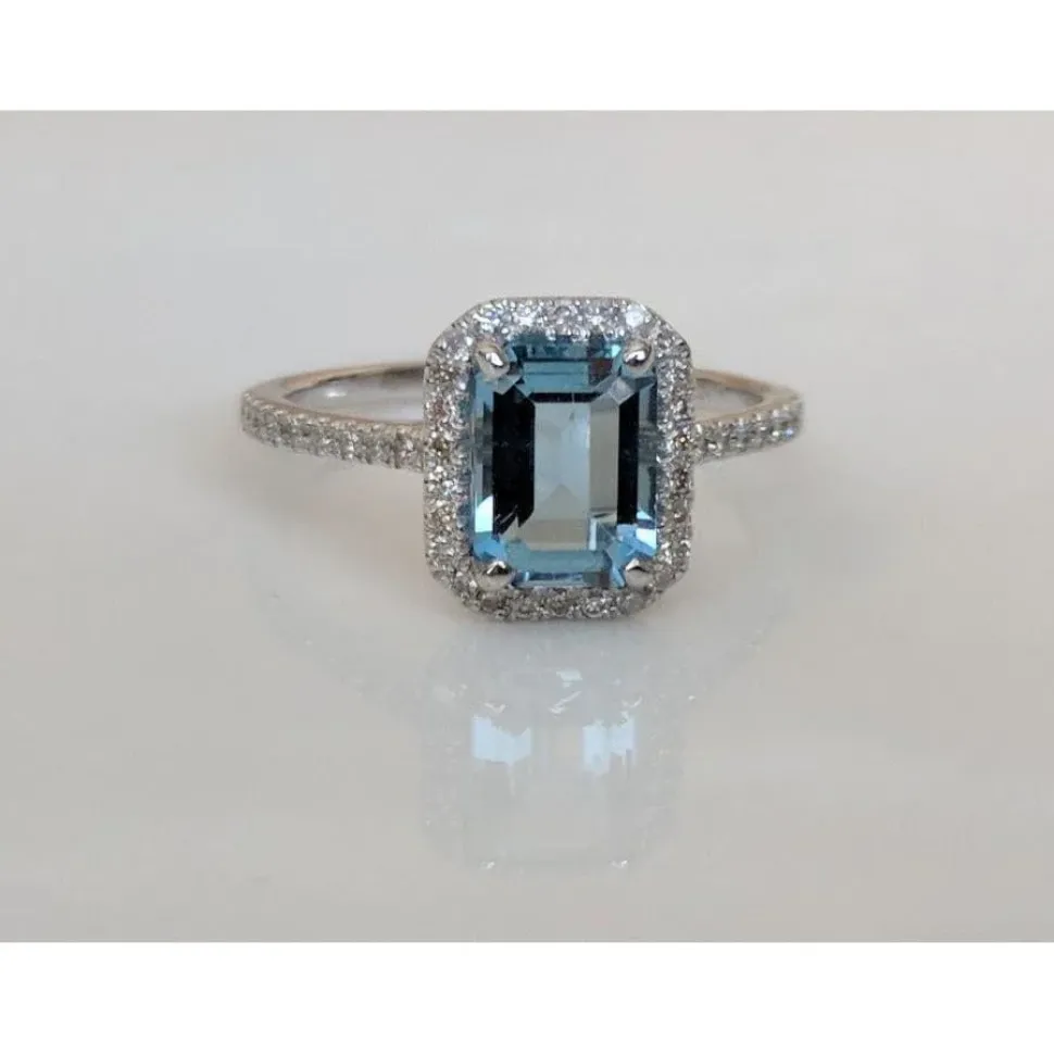 This is one of the most beautiful Genuine Aquamarine and Diamond rings, the setting is classic. A gorgeous AAA quality 1.37ct emerald cut aquamarine is front and center, surrounded by .26cts sparkling diamonds in a delicate 14K solid white gold setting. You will be stunned by the beauty and even more so by the affordability of this spectacular ring if you compare prices at jewelry stores. This ring would make an incredible engagement ring for the daring bride. New, never worn. Appraised by a local, very critical jeweler.