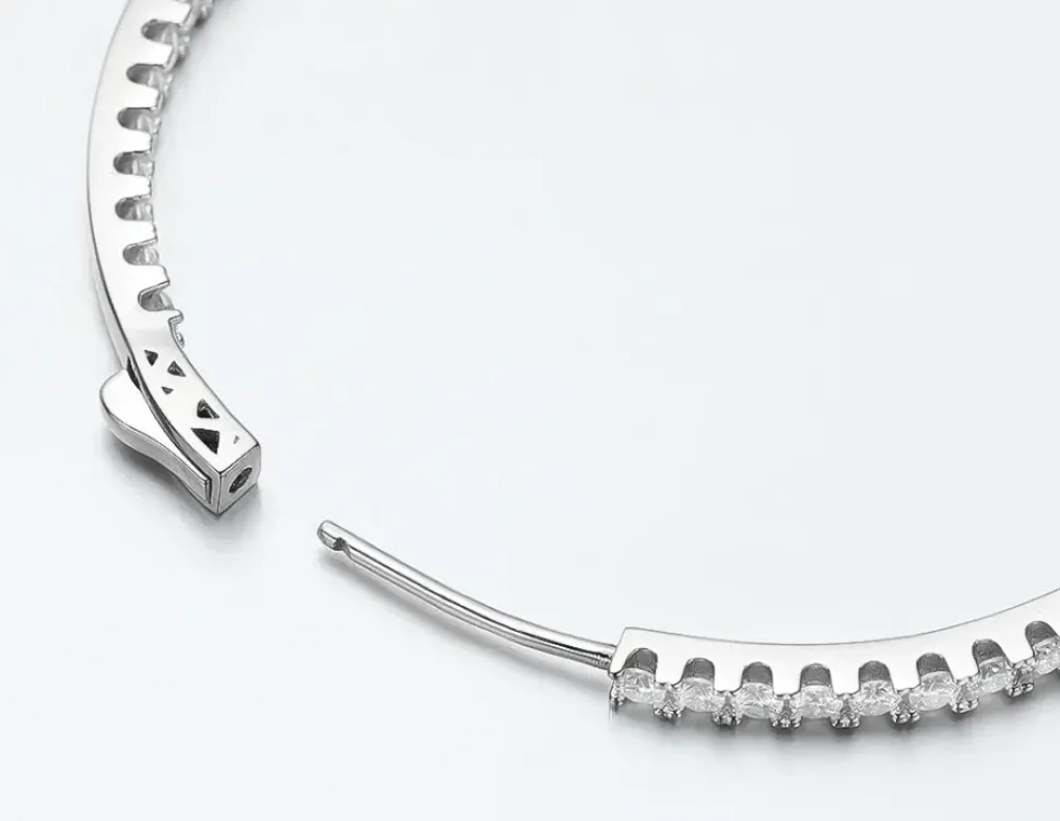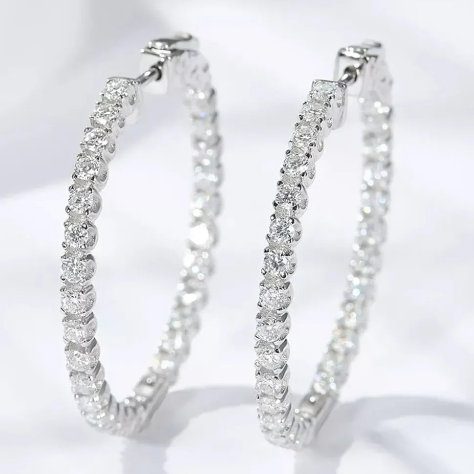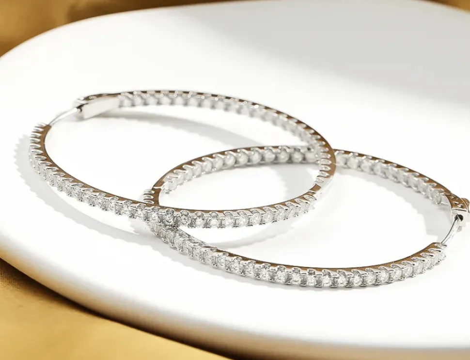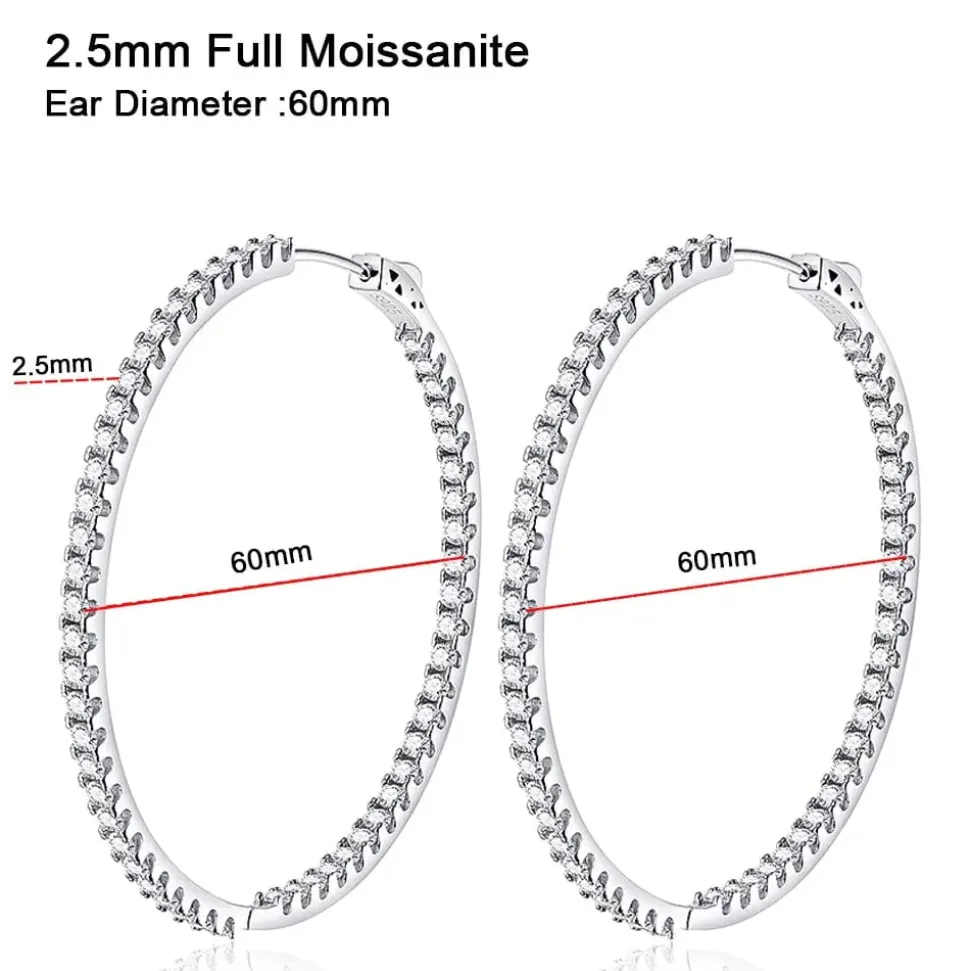 These Big Moissanite Hoop Earrings are sure to turn heads with their 60mm of dazzling beauty crafted in 925 Sterling Silver. Featuring an ultra secure locking clasp, these large hoops house 2.5mm stones to make an eye-catching statement. Now you can have a manmade ethical diamond alternative that’s as hard as diamonds and tests as diamonds but has more sparkle than diamonds!
