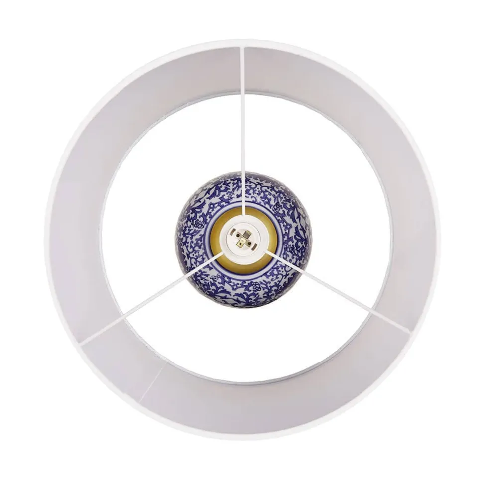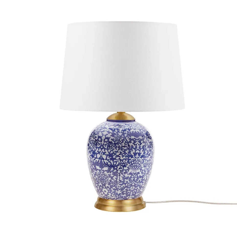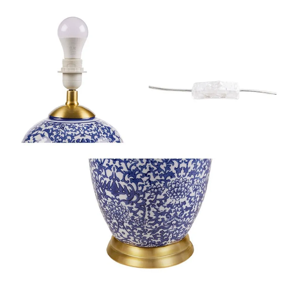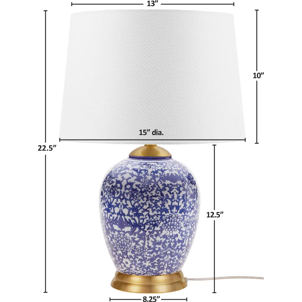 Introducing this gorgeous blue and white Ginger Jar Table Lamp, drawing inspiration from traditional ginger jars. Its ceramic body features an exclusive blue chinoiserie pattern with a white tapered drum-shaped shade. Adorned with opulent gold accents on the lamp base and neck, it includes an on/off switch and a 60″ clear cord. Equipped with a 9W LED bulb, it ensures radiant illumination. Illuminate your surroundings with this exquisite fusion of artistry and functionality.