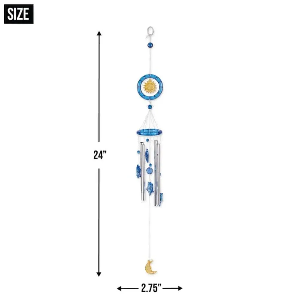 Colorful chime bedecked with bright acrylic celestial shapes is sure to be the “star” of your garden! Features a beautiful Golden sun and a golden moon surrounded by blue stars that sit inside the chimes to create a beautiful tone. Don’t miss out on this absolutely stunning piece of art.