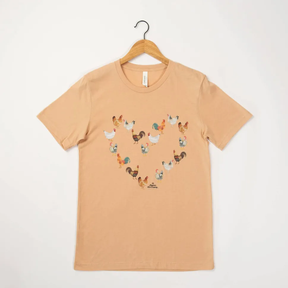 Calling all chicken lovers! This one’s for you: our adorable heart-shaped chickens adorn this cute t-shirt designed for our farmers and friends of chickens. Wear it with pride! Be sure to check out all of our awesome chicken-themed products to complete your ensemble and show your love for these amazing critters.