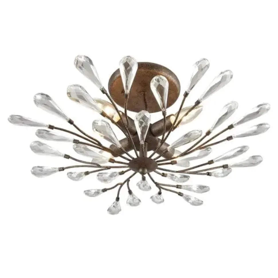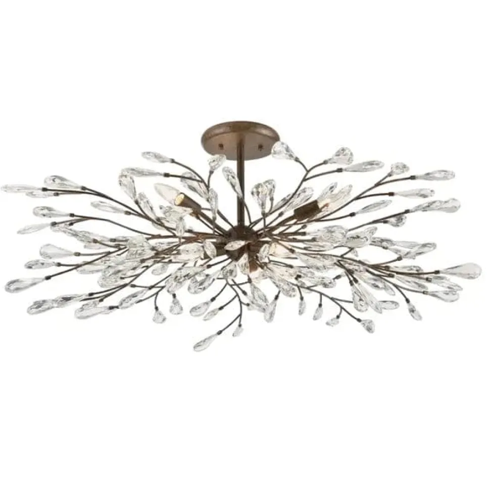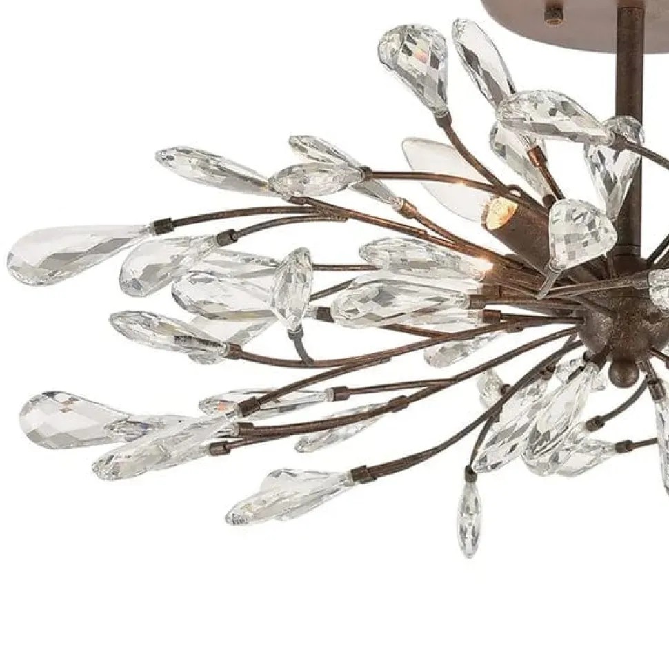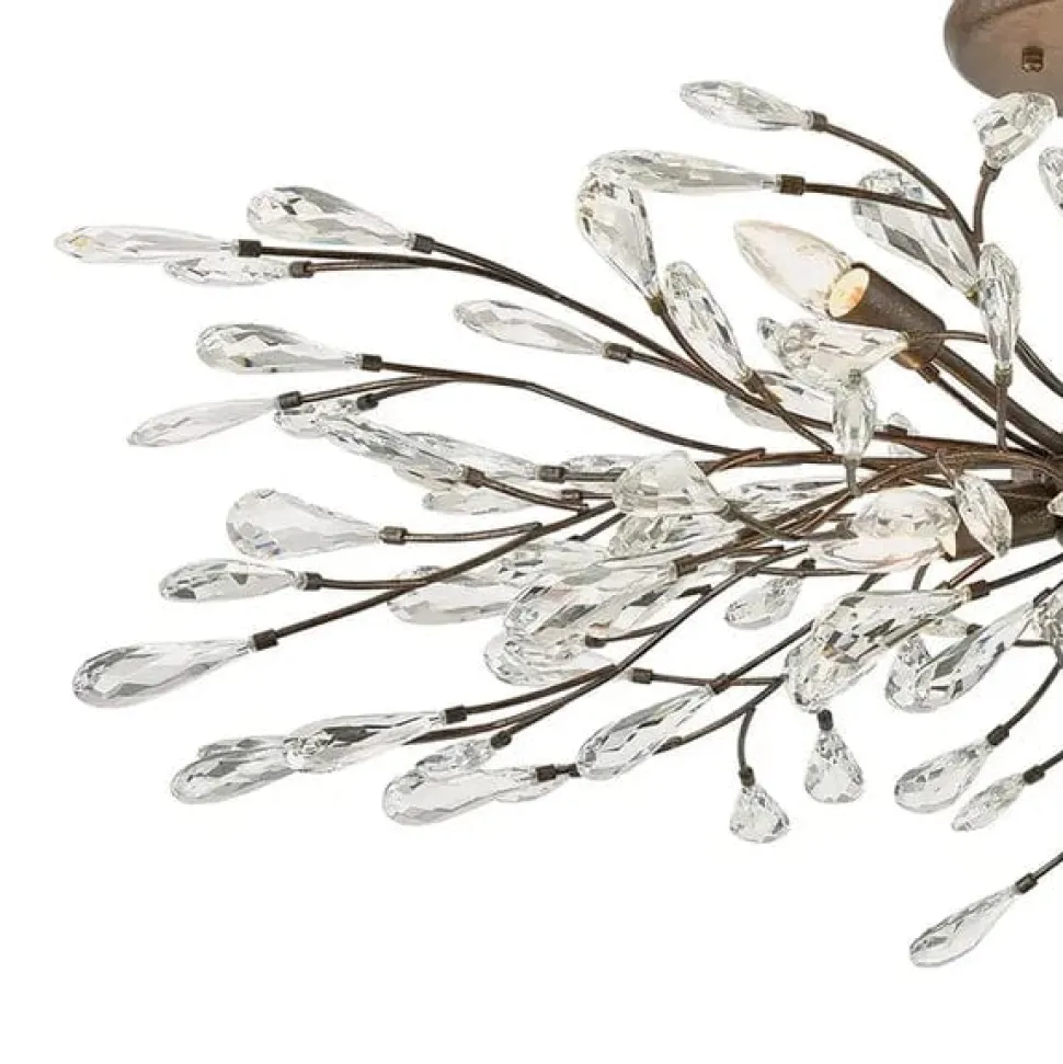 Inspired by the silhouette of a winter forest, the Crislett semi flush embraces the twists and turns of tree branches. At the ends of these branches are an abundance of substantially sized crystal “buds” which add a winter-like sparkle amidst the Sunglow Bronze finish.