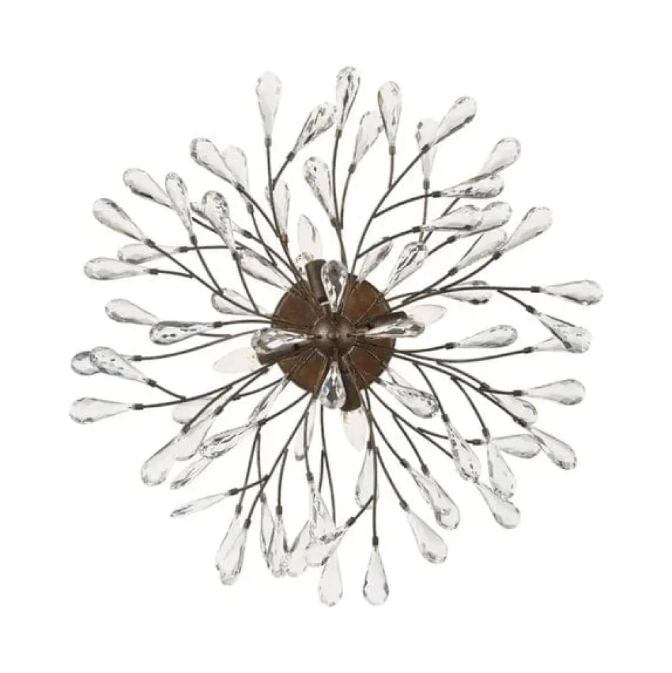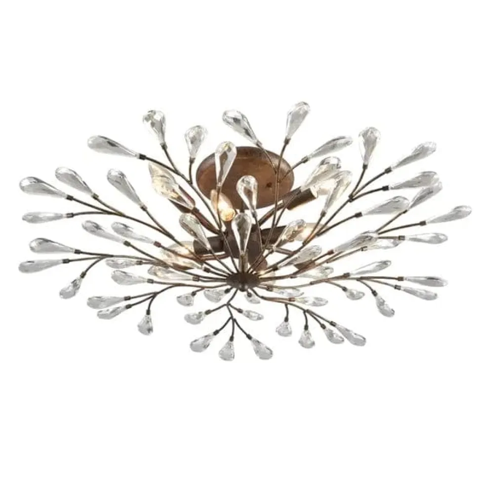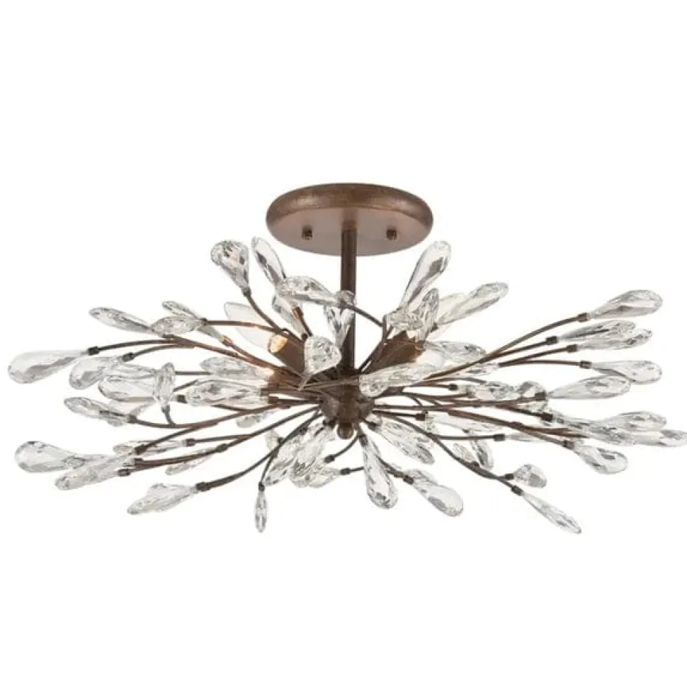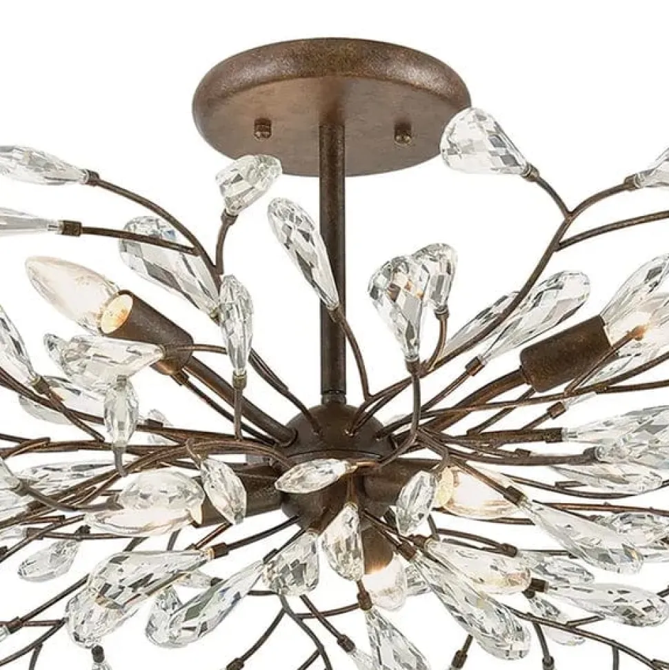 Inspired by the silhouette of a winter forest, the Crislett semi flush embraces the twists and turns of tree branches. At the ends of these branches are an abundance of substantially sized crystal “buds” which add a winter-like sparkle amidst the Sunglow Bronze finish.