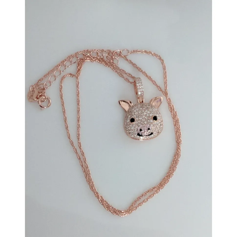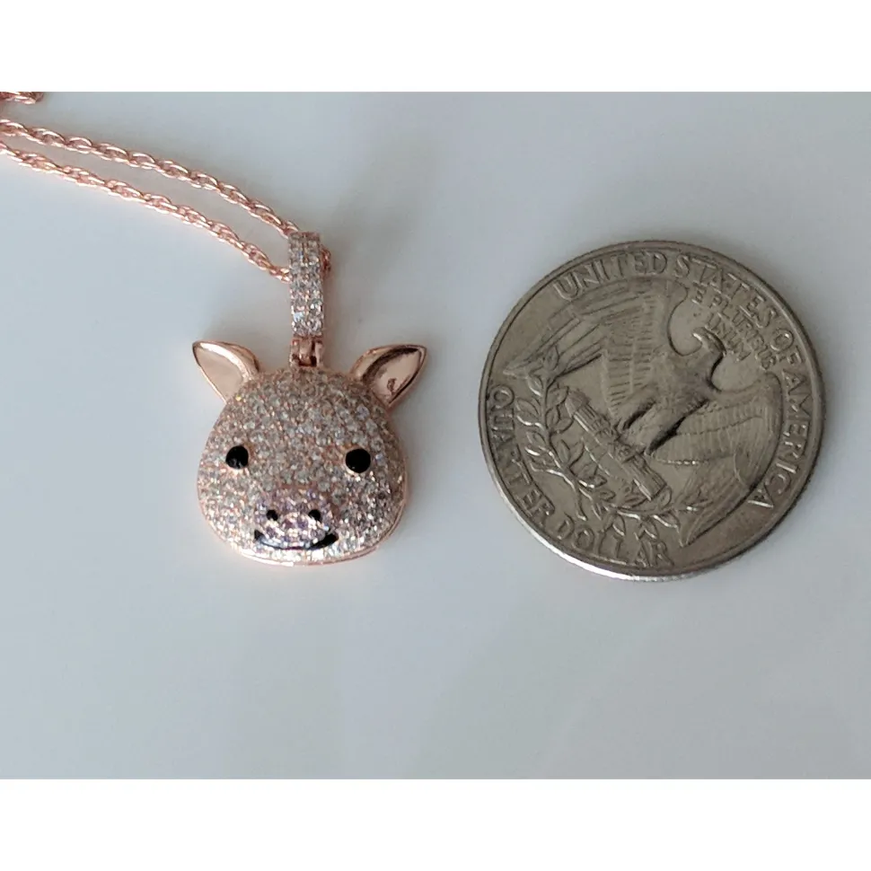Custom made sparkly rose gold pig pendant in solid 925 Sterling Silver. Beautiful, specially made for our pig-loving friends. 14K rose gold plating and covered in sparkling CZ to make it ultra sparkly for our friends who like bling AND pigs! You will NOT find this specially-made piggy anywhere else and the price is very reasonable too!