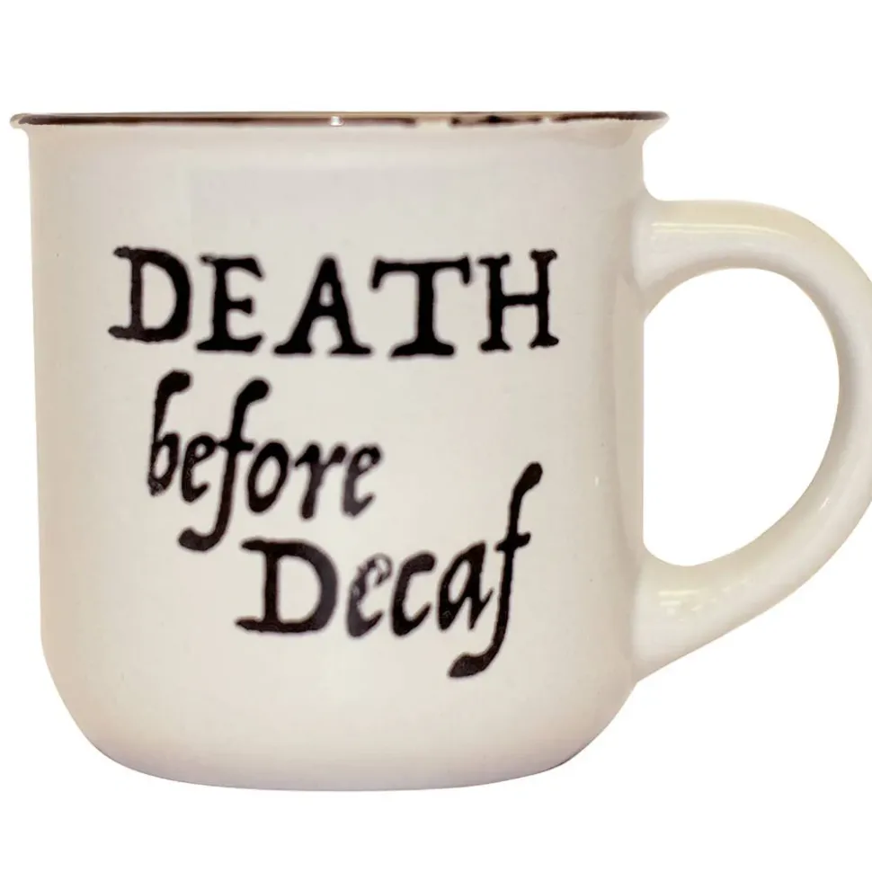 Start your day off with a quick shot of espresso with this espresso cool grey mini mug – “Death Before Decaf”. Stamped Ceramic, simple vintage design.