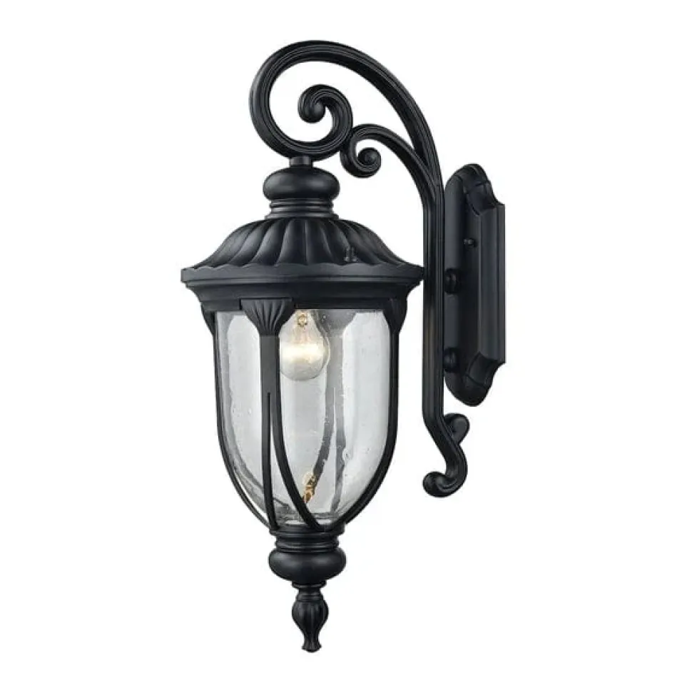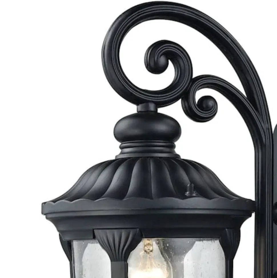 The Derry Hill outdoor collection features a traditional design with a cast aluminum construction. A scalloped top and detailed scrolled arm add texture traditional appeal. Finished in matte black with seedy glass.