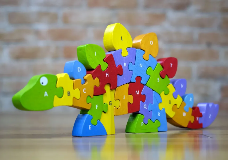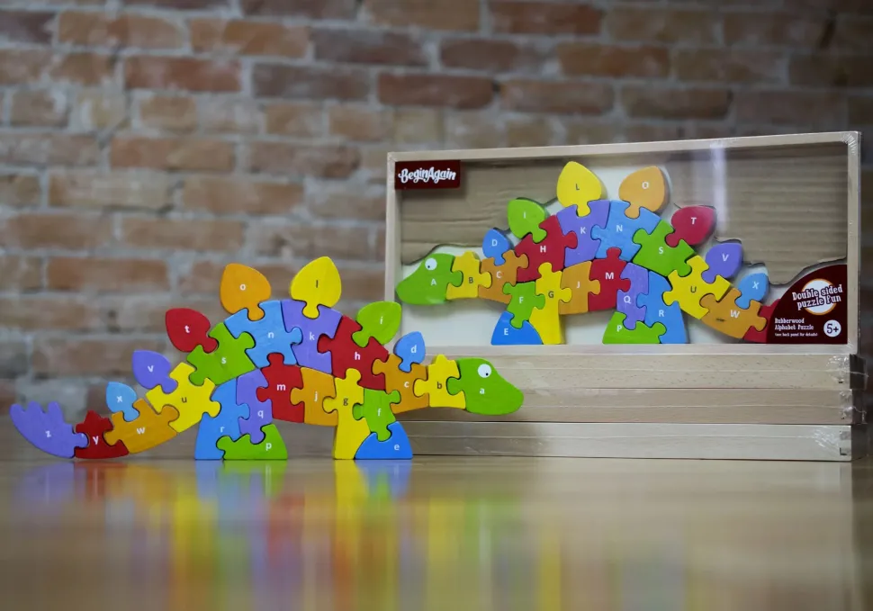 Alphabet and puzzle based problem solving come together to make this chunky wooden dinosaur come to life. Made from durable rubberwood, this 26 piece alphabet toy is one top selling puzzles of all time. S.T.E.A.M. starts here. Dino puzzle features lower case letters on one side, upper case on the other. This dinosaur puzzle teaches problem solving, alphabet sequence, letter identification while inspiring your child’s imagination. This durable rubberwood puzzle can be solved standing up or in it’s wooden storage tray. Easy clean and storage. Made from planet smart rubberwood with child safe water based stains – this wooden dino puzzle teaches alphabet, problem solving, and inspires dinosaur tales.