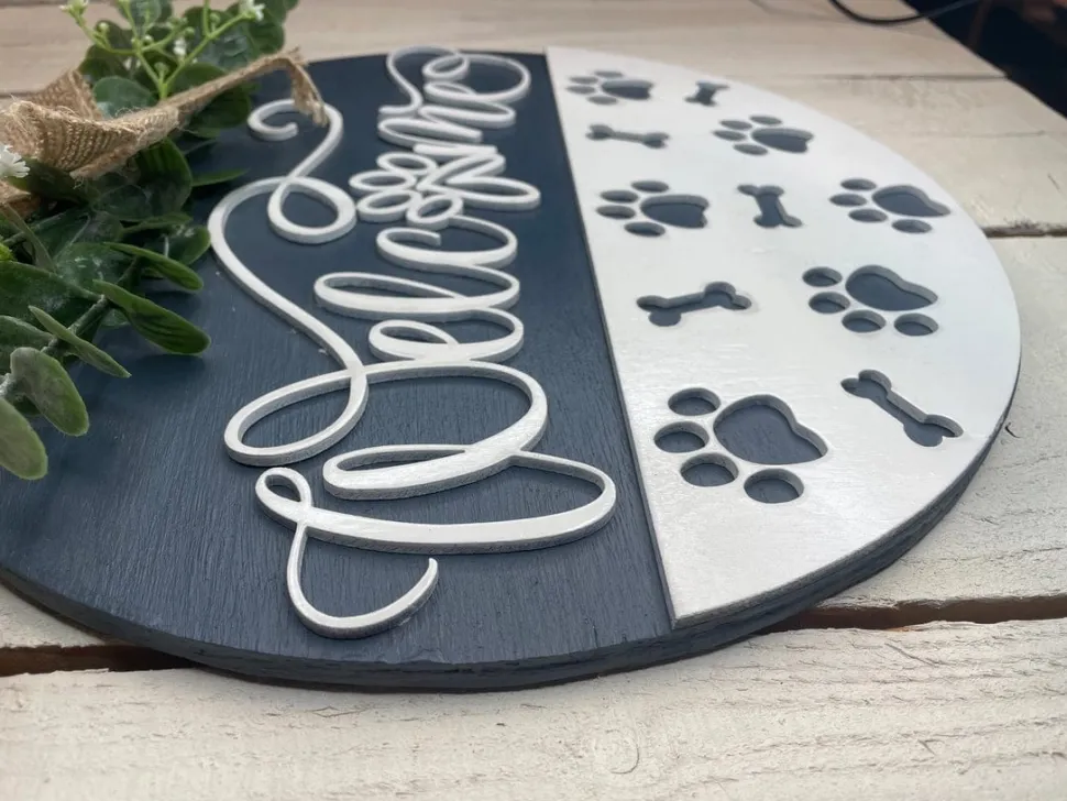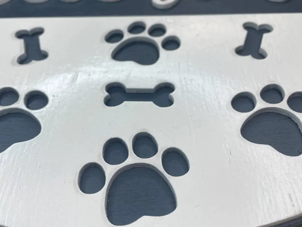 Add a welcoming touch to any dog lover’s home with this adorable dog paw and bone design sign. Welcome your guests in style with this charming home decor sign. Perfect for dog lovers, this sign is crafted with intricate dog paw and bone cutouts, making it a unique and playful addition to any home.