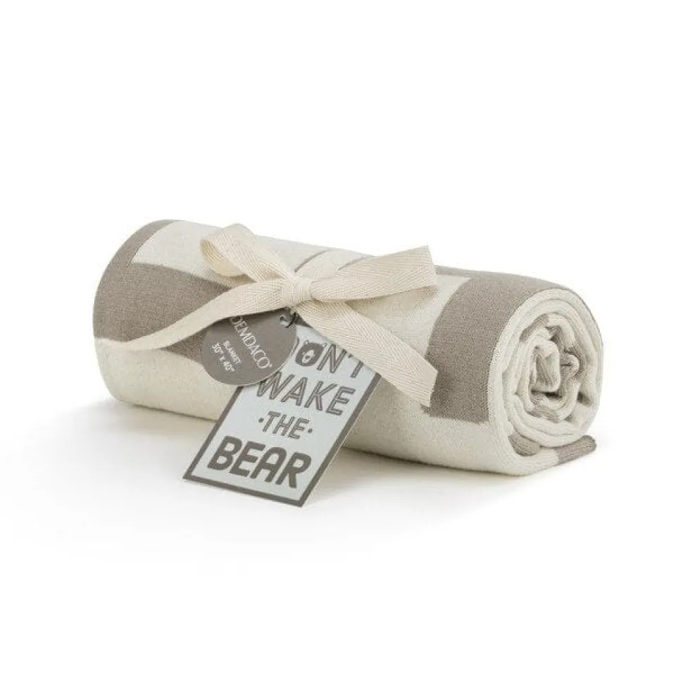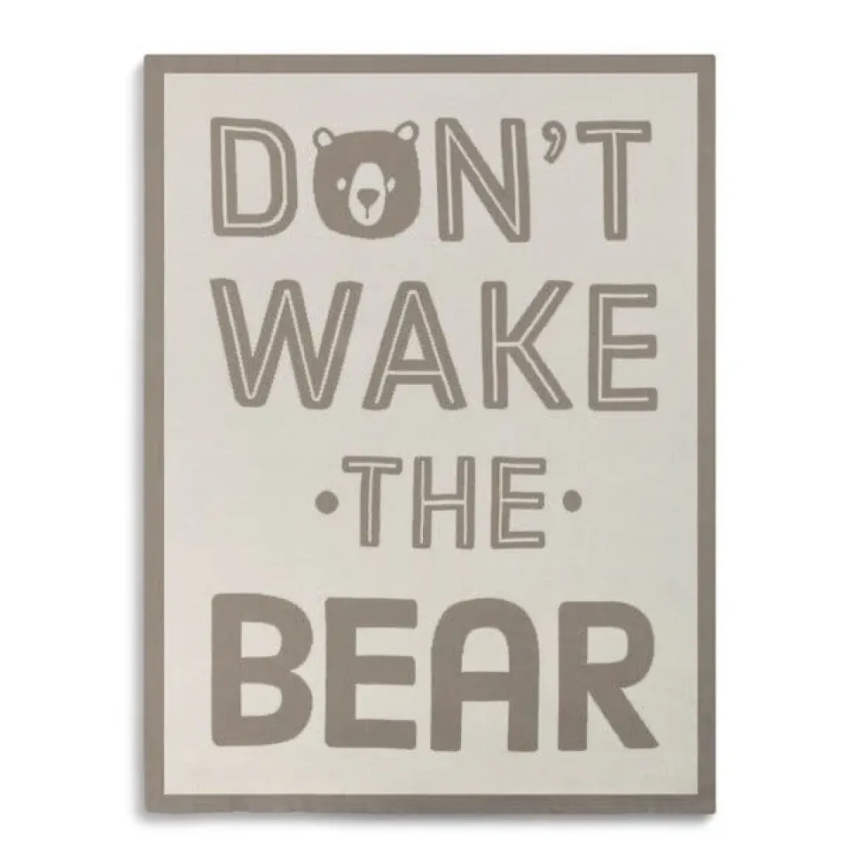 The Don’t Wake the Bear Woven Blanket is a cozy and uplifting addition to any nursery. These lighthearted and humorous woven 30” by 40” baby blankets nurture loving laughter with silly sayings made for playful snuggles. Offering a fun way to tuck toddlers in at nap time, they are made of the softest materials with fun sentiments and modern designs meant just for your silly little one. Hand-woven in India, dusty tones is perfectly suited for the modern nursery and gift out-of-the-box giggles to parent and child. Messages inspire a look at the lighter side — this one says, “Don’t wake the bear.”