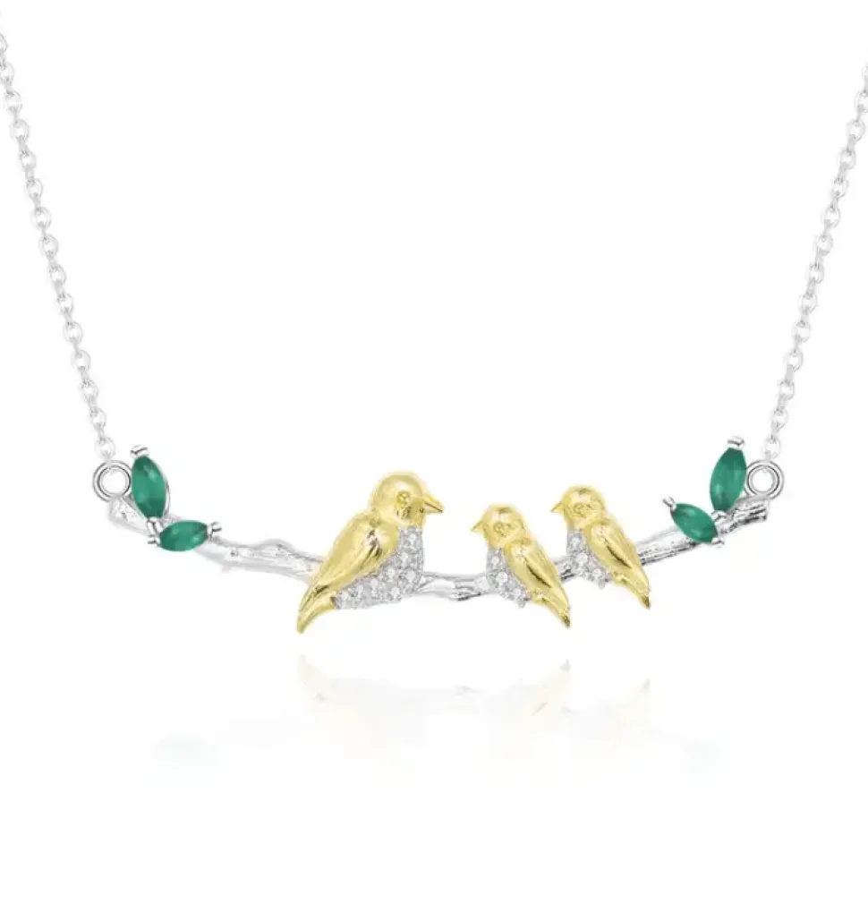 Update your look with this beautiful and elegant bird necklace. Crafted with 925 sterling silver and gold plated, this handcrafted necklace is perfect for any occasion. Show off your personal style with the gold agate gemstone and feel confident knowing it’s waterproof and tarnish-proof! 18 inch chain with Mother bird and baby/babies with green agate leaves.