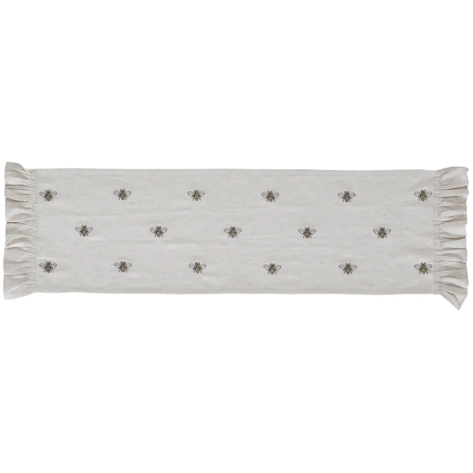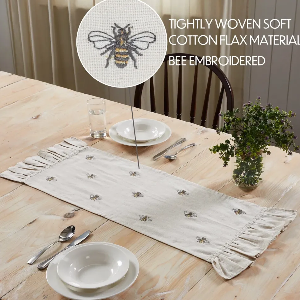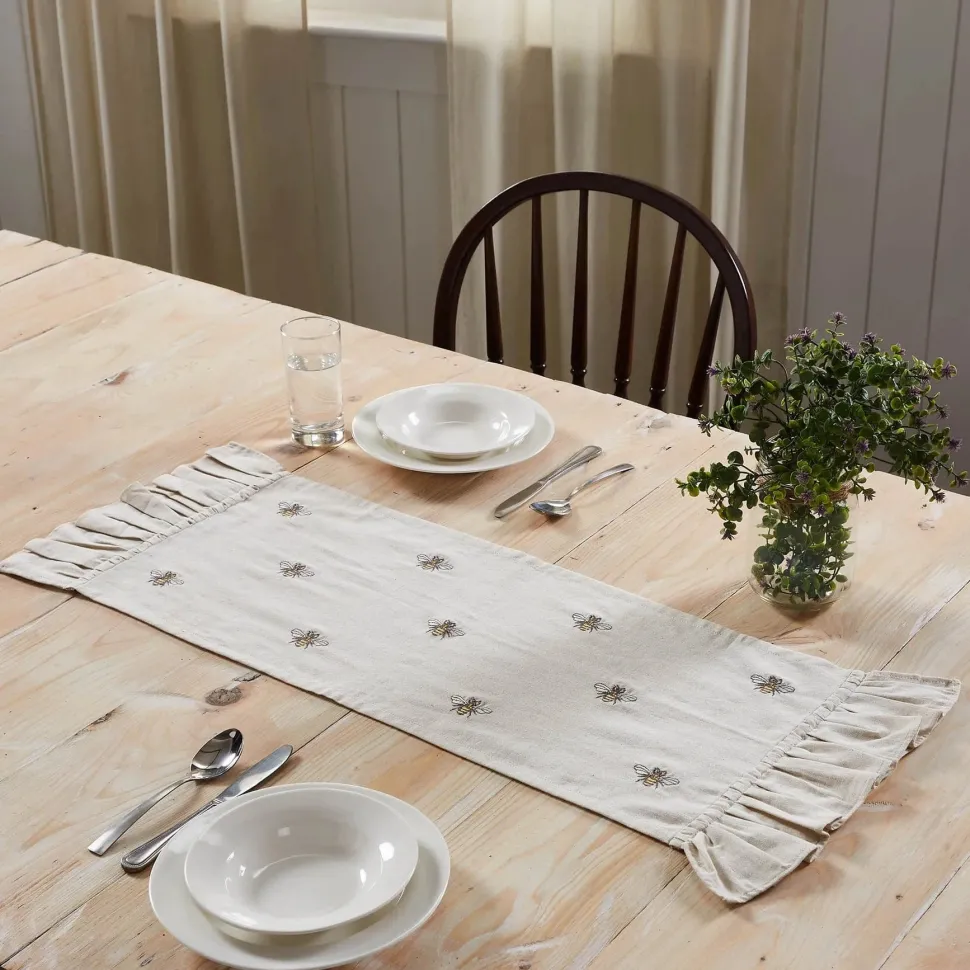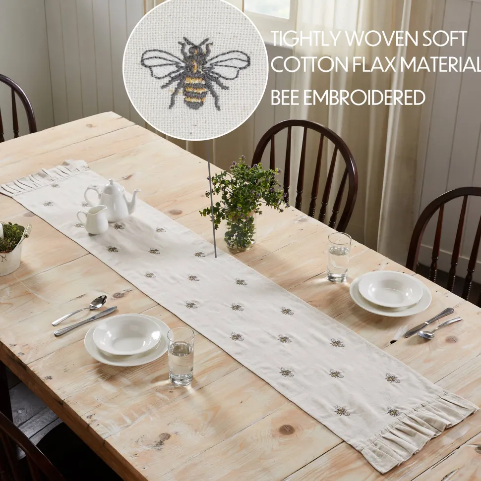Bee Lovers! Transform your table with beautiful Embroidered Bee Placemats and Table Runners, featuring a textured, cotton flax base fabric with bee embroidery in natural creme, soft yellow, and charcoal grey. Accented with gathered ruffles on each end. BEE-UTIFUL!!!