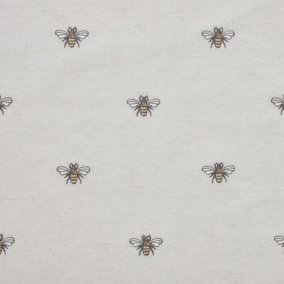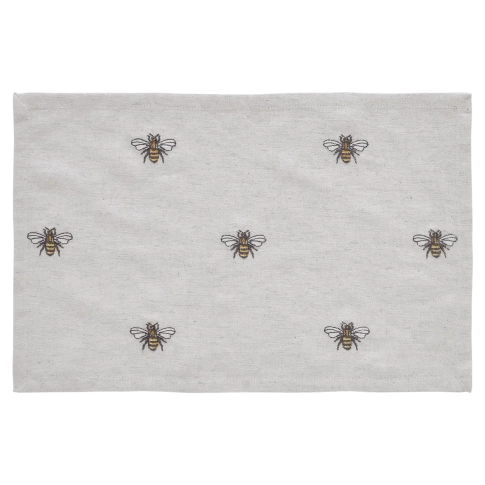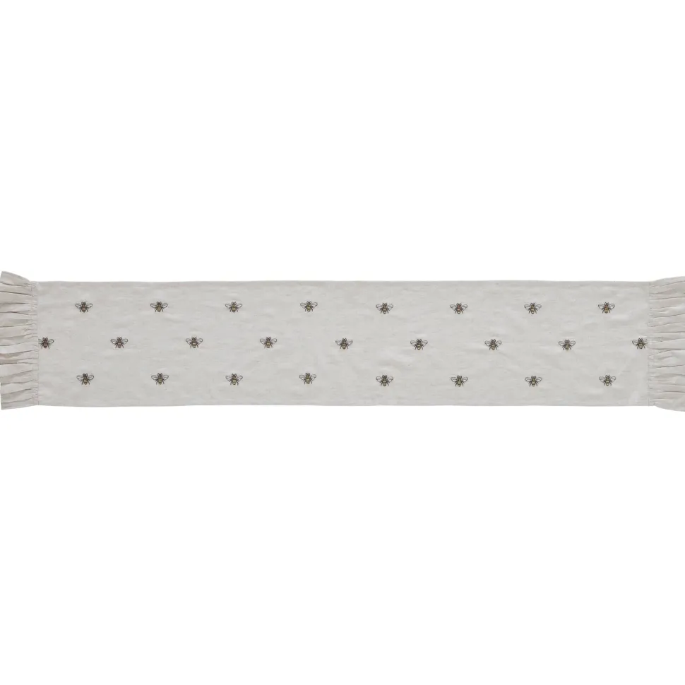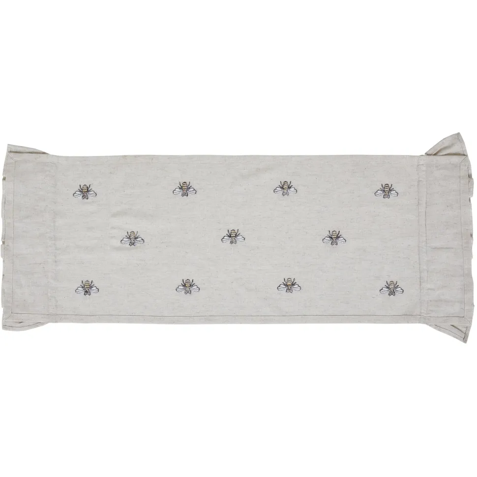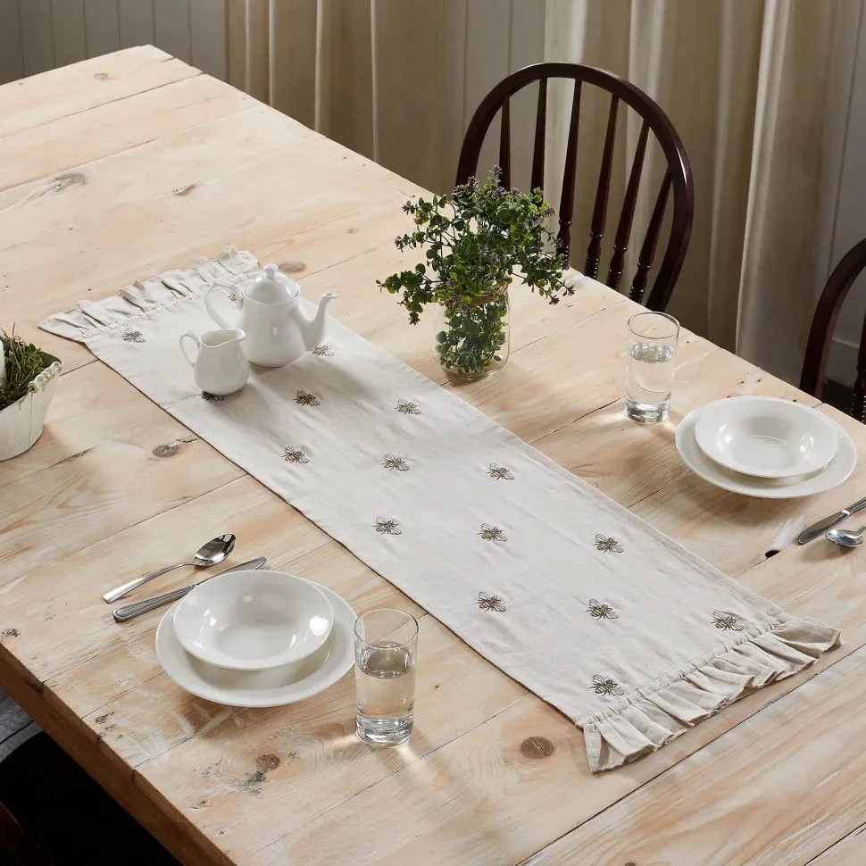 Bee Lovers! Transform your table with beautiful Embroidered Bee Placemats and Table Runners, featuring a textured, cotton flax base fabric with bee embroidery in natural creme, soft yellow, and charcoal grey. Accented with gathered ruffles on each end. BEE-UTIFUL!!!