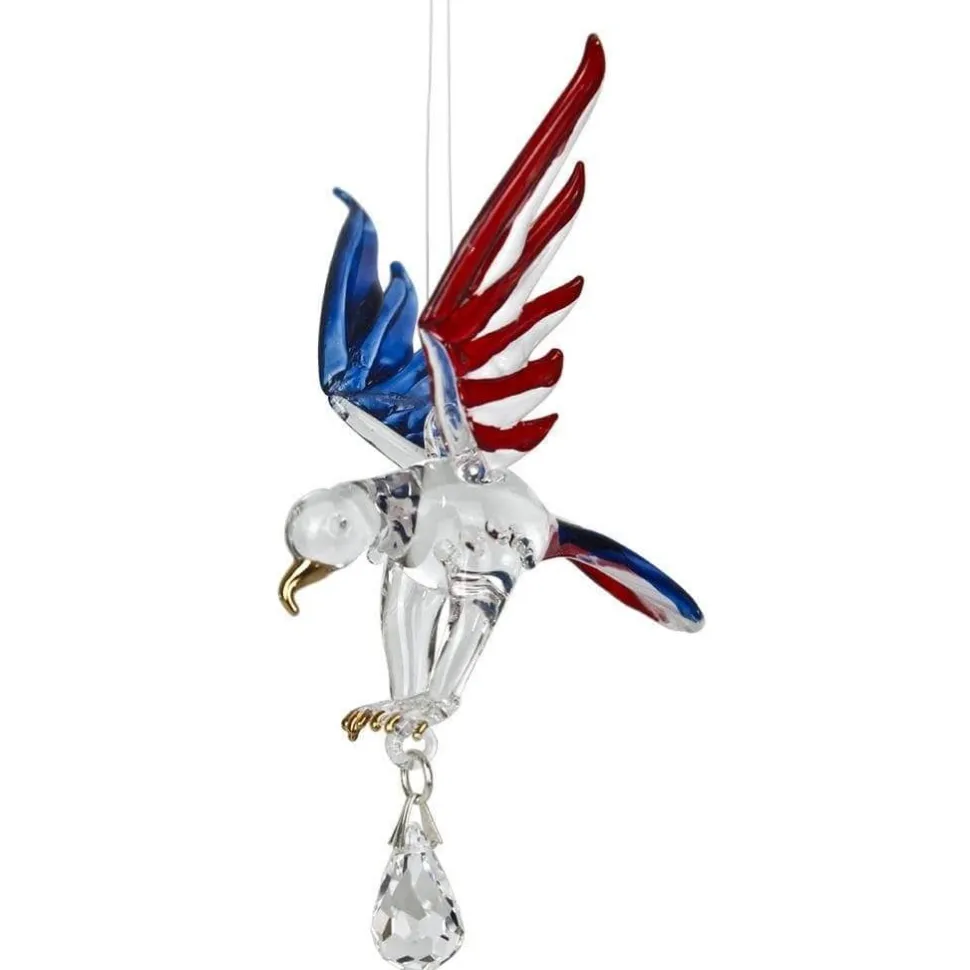 A patriotic eagle shows off his “stars and stripes”! Eagles are symbols of strength, leadership and vision. They remind us to be stretch our limits and “take flight.” Hand-painted in the colors of the American flag, this hand-blown glass eagle tops a genuine Austrian crystal that sparkles and shines in the sun. One wing represents the blue field, the other sports red and white stripes, and the eagle’s talons and beak are painted with 24 karat gold.