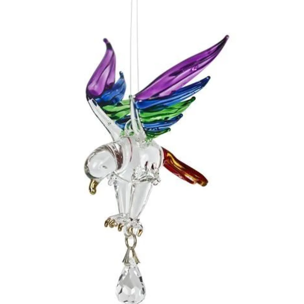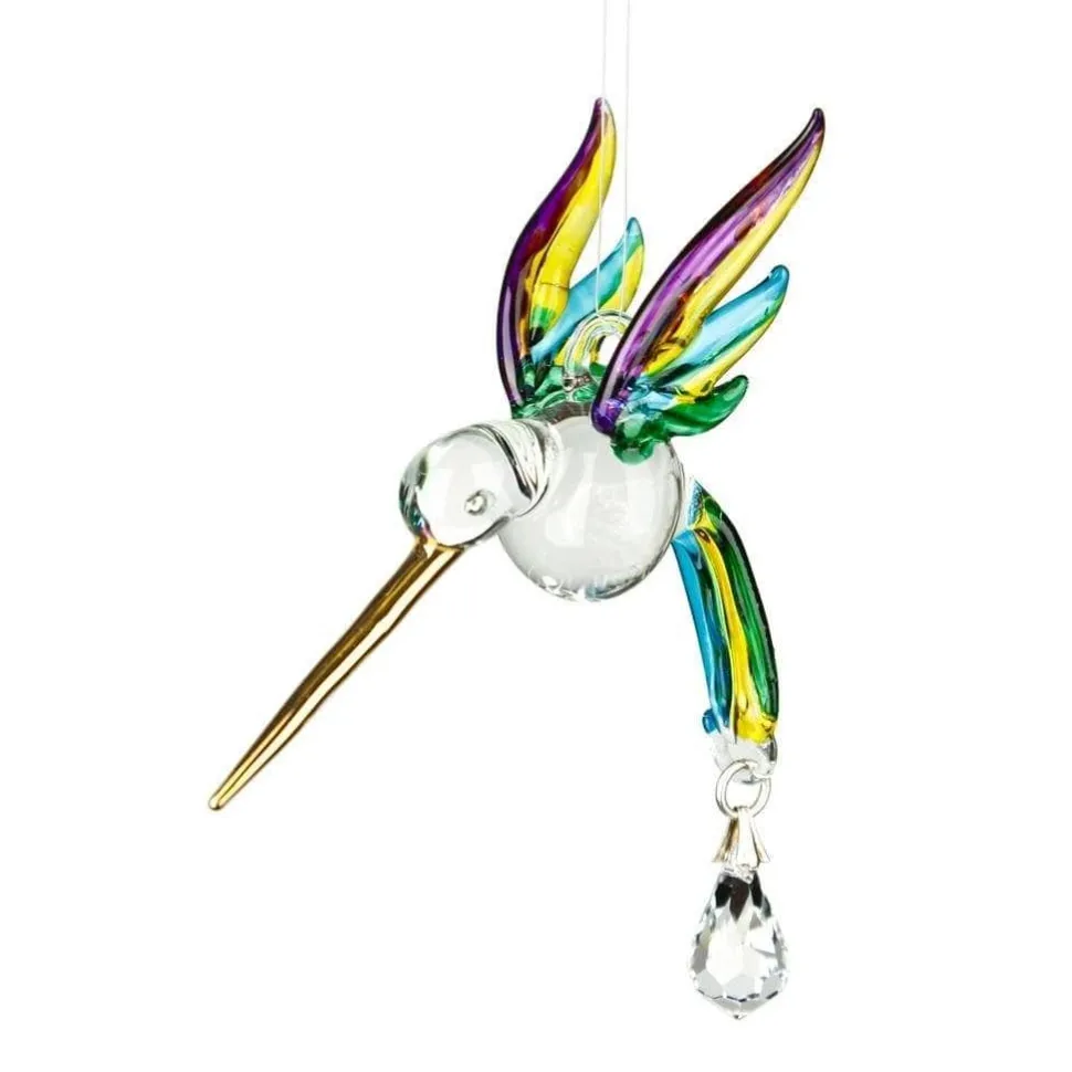 A hand-crafted glass hummingbird sun catcher in shades of spring with a crystal accent.