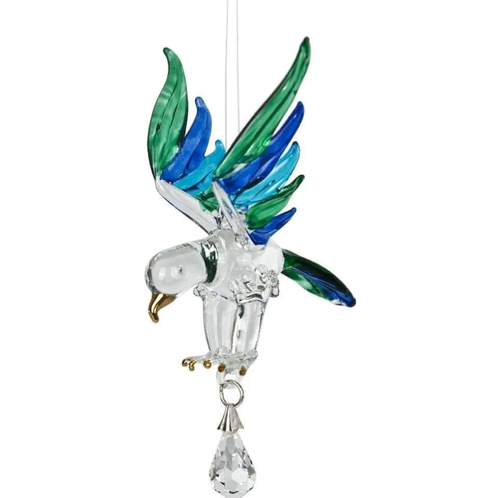 A handcrafted glass bird featuring a crystal accent. Songbirds are protective spirits associated with music. Hand-painted in glorious tropical colors, this hand-blown glass bird tops a genuine Austrian crystal that sparkles and shines in the sun.