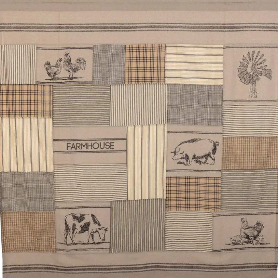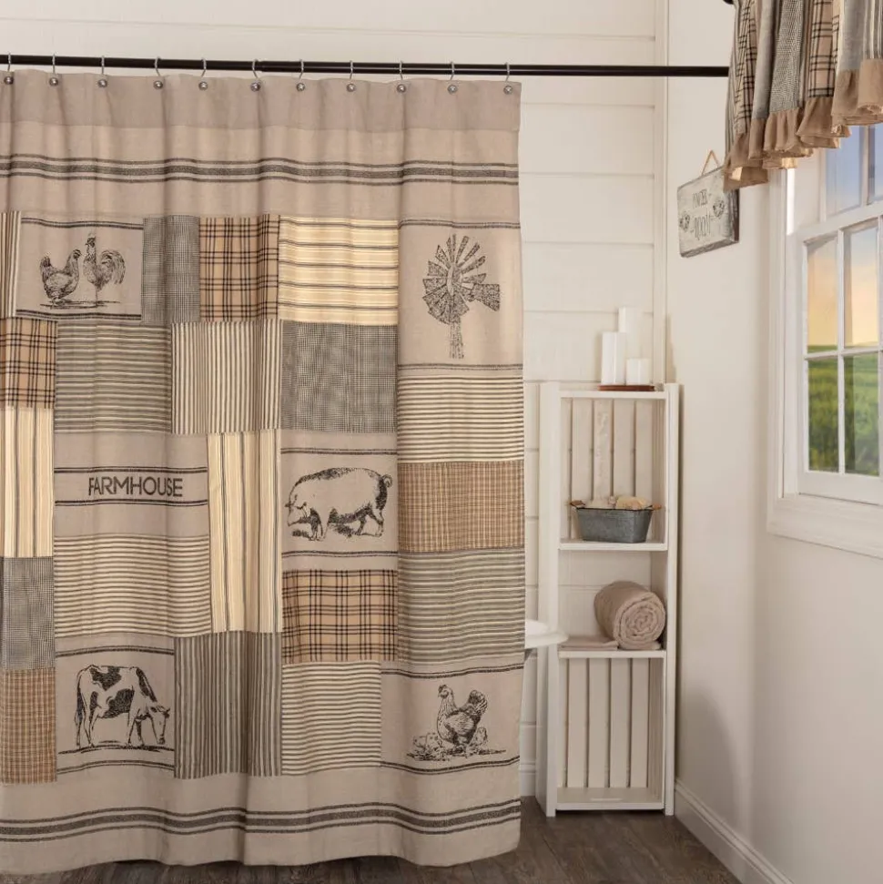 Farm animal lovers will really love this beautiful shower curtain by Sawyer Mill. Accessorize your bathroom with a splash of farmhouse decor with the Sawyer Mill Charcoal Stenciled Patchwork Shower Curtain 72×72 for a casual farmhouse look. Featuring irregular block layout in various plaid and striped Farmhouse fabrics, accented by stenciled farm themes on textured khaki chambray. A special farmhouse touch includes stenciled blocks contain chicken, windmill, pig, cow, and “Farmhouse” themes. Easily hang this farmhouse shower curtain with 1.5 inch header with 1 inch button holes and 3 inch rod pocket.