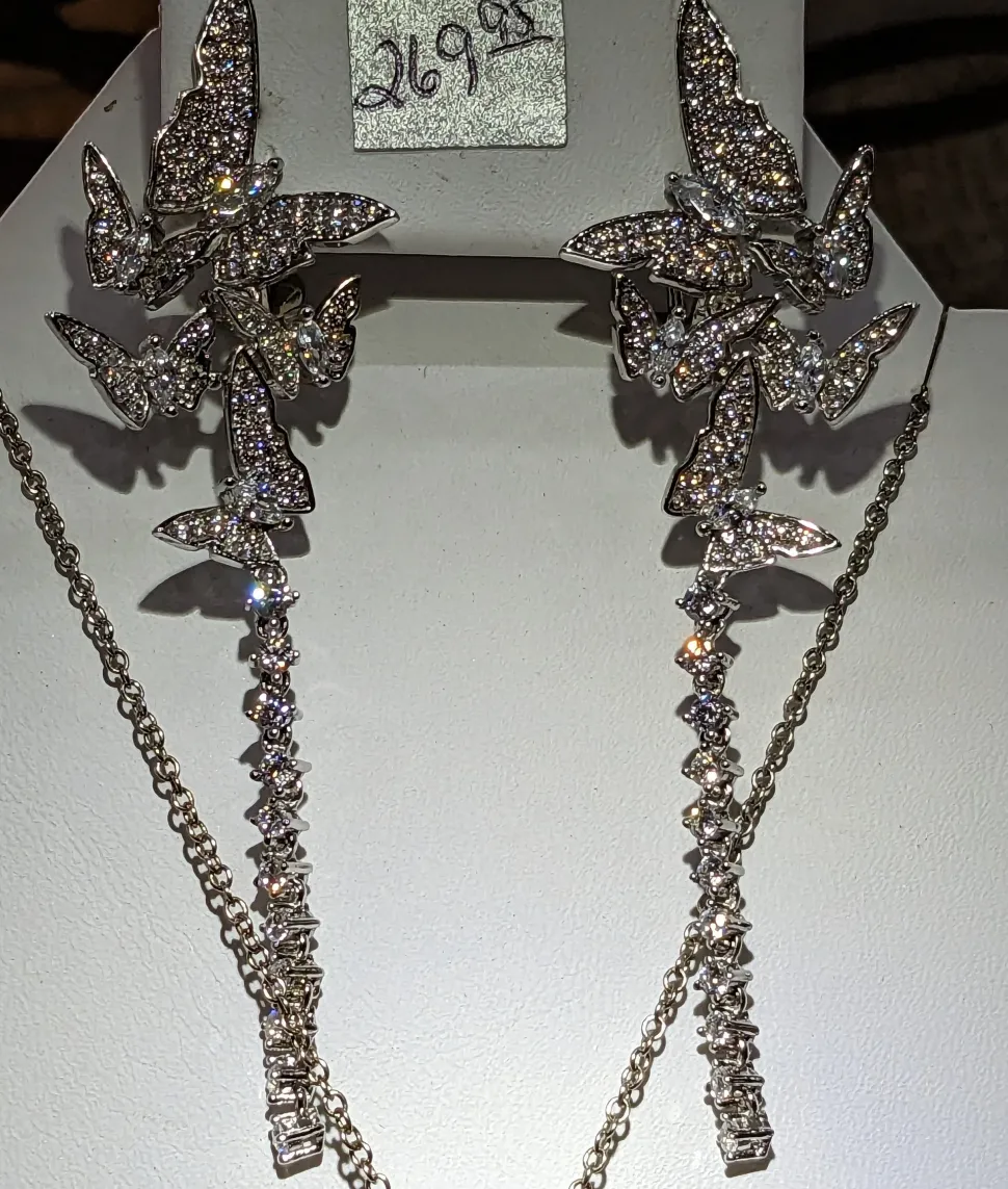 The most gorgeous butterfly necklace and earrings for special occasions, this set is SPECTACULAR! It is difficult to catch the sparkle with the camera but these pieces are high sparkle made with the highest quality 5A CZ and high quality 18K gold plated fine sterling silver. Choose the set for the most stunning look for a wedding, prom, graduation or elegant night out. Perfect for parties. This is a one of a kind jewelry set of the finest quality at a very affordable price and ALL proceeds go to charity to help rescued animals. This is the only set made and available!