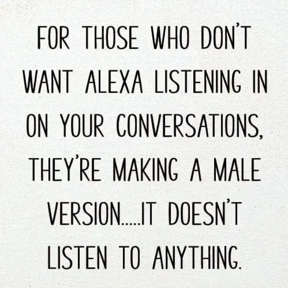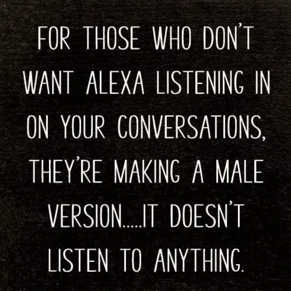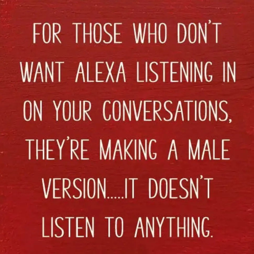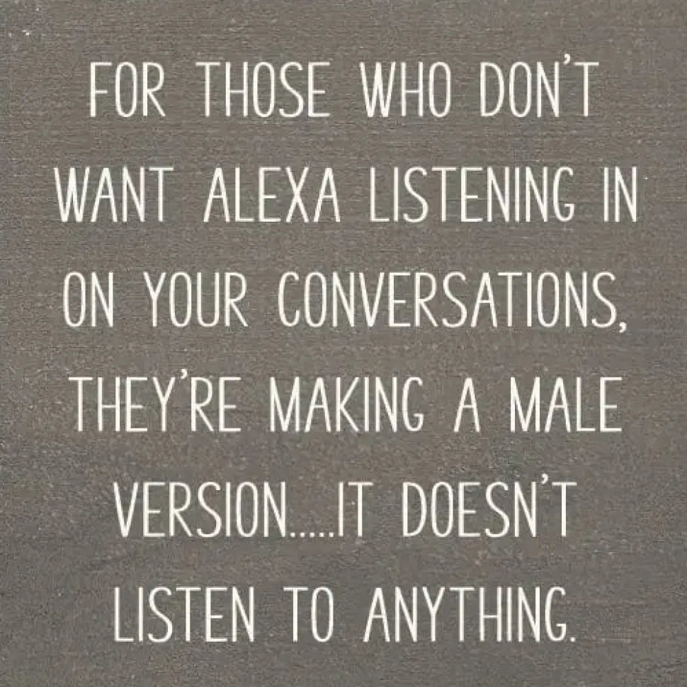 Funny handmade in the USA solid wood sign with the saying, “For those who don’t want Alexa listening in on your conversations, they’re making a male version…it doesn’t listen to anything.”