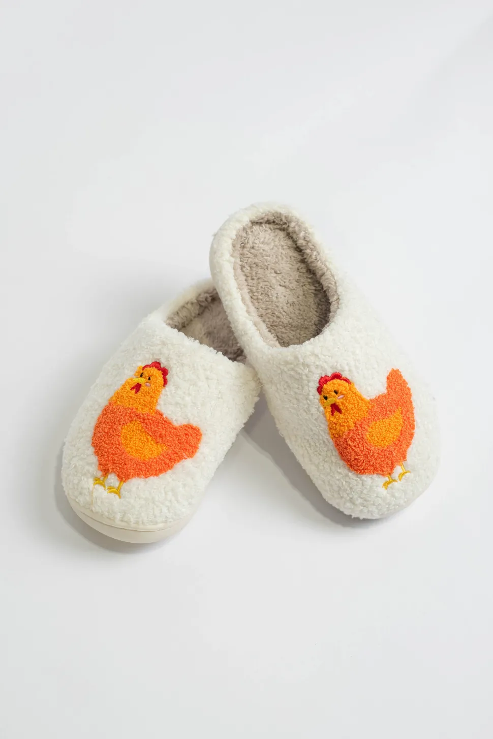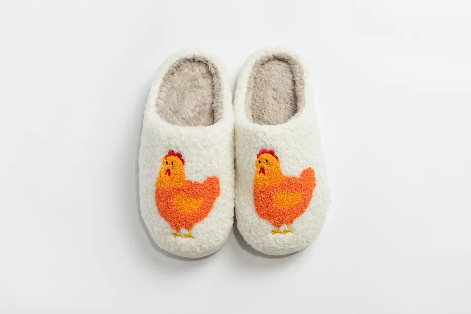 Introducing our quirky and cozy Chicken Slippers, where comfort meets whimsy! Crafted in the USA with soft materials, these slippers provide a plush, cushioned experience for your feet. Their unique chicken design adds a touch of fun to your loungewear, making them a conversation starter wherever you go. With a non-slip sole, you can strut around confidently on any surface. Slip into these comfortable and charming slippers for a delightful blend of style and comfort. For our chicken lovers, a wardrobe must!