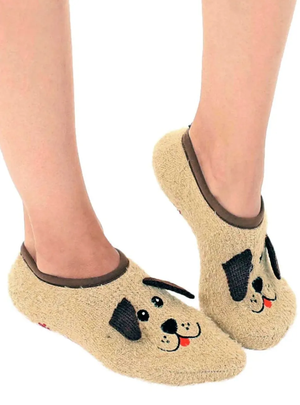Adorable little puppy dog fuzzy slipper socks with paw print grippies on the bottoms to keep you safe on slippery floors. Cute gift for dog lovers, these are sure to bring smiles.