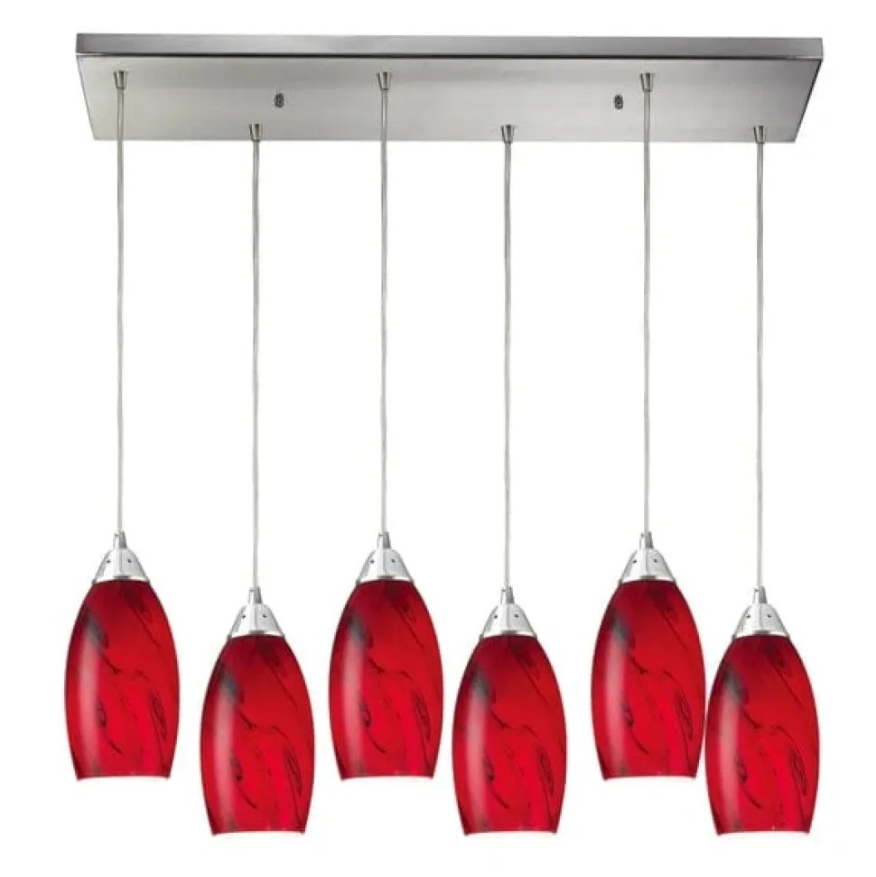 The Galaxy 6-Light Rectangular Pendant with Red Glass is a sleek and modern lighting fixture that will elevate any space. With its unique design and vibrant red glass, this pendant will add a touch of style and sophistication to any room. Its 6 lights provide ample illumination, making it both functional and visually appealing. Perfect for adding a pop of color and personality to your home or office.