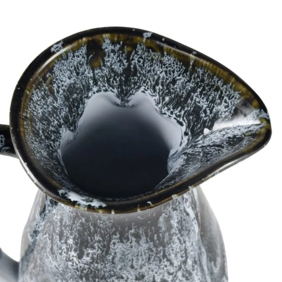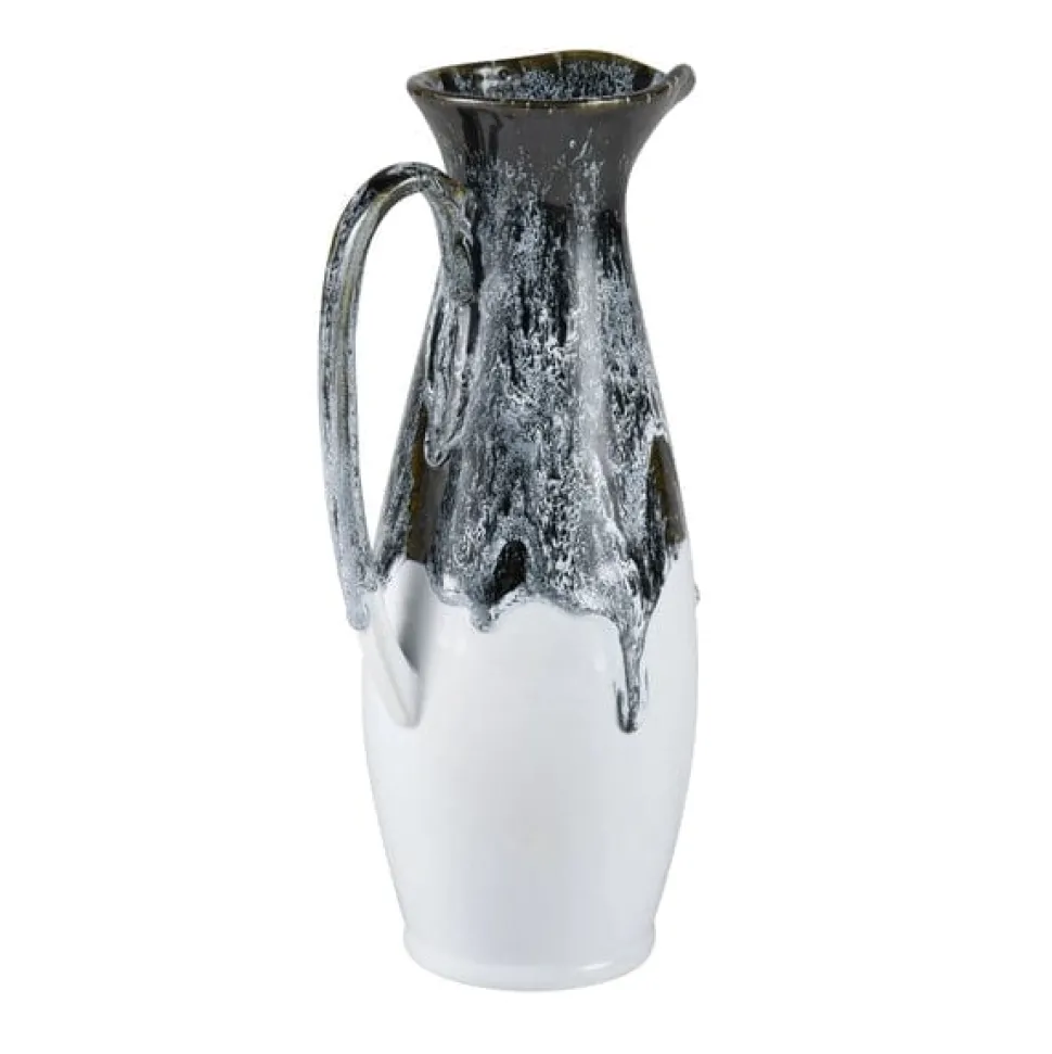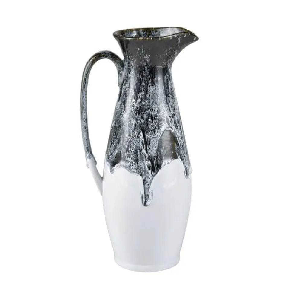 The Gallemore Pitcher is a tall narrow earthenware pitcher with a single curved handle. The pitcher is finished with a hand-applied black and white crackling glaze that drips from the top to the center where it meets a white ceramic base.