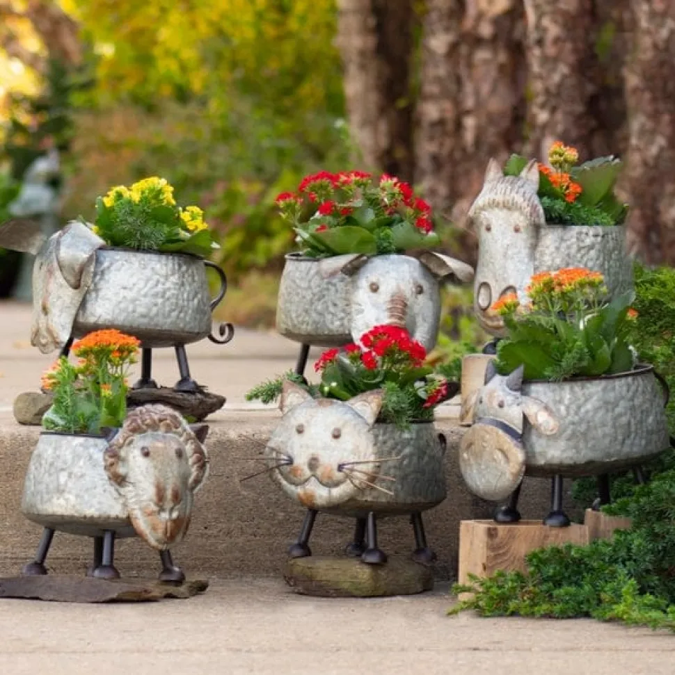 Have the fun of the farm animals without the cost (and work) with this Set of 6 Assorted Galvanized Animal Planters. Sell the farm together, or let your customers choose their favorites with our adorable cow, kitty, sheep, piggy, dog, and of course, a horse! Made of galvanized metal, each planter is sturdy and weatherized, which make them durable and built to last!