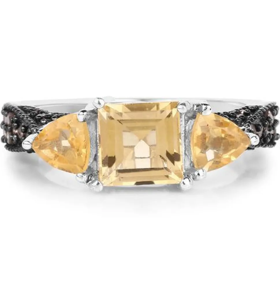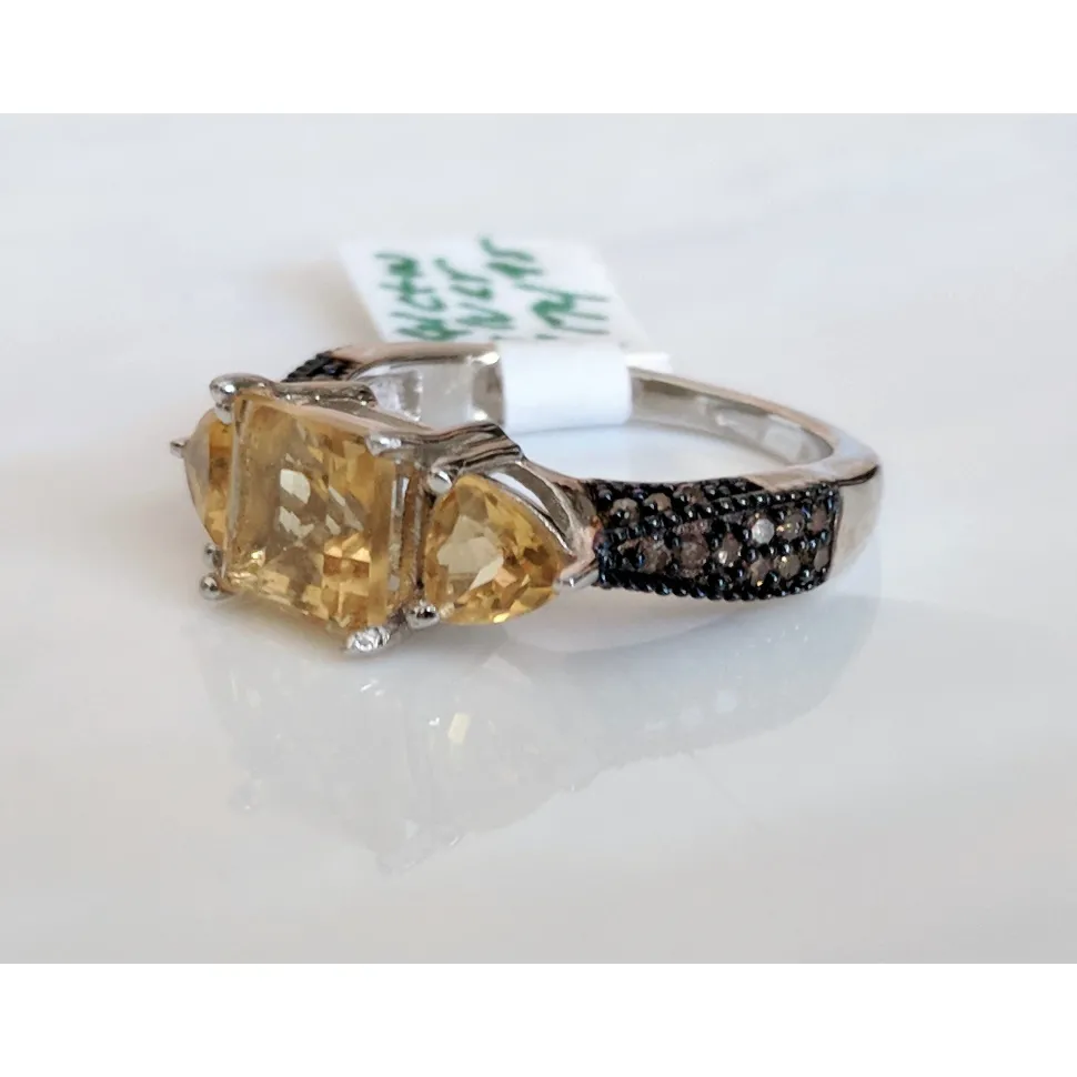 This exquisite ring is truly one-of-a-kind and sure to stand out. The champagne diamonds enhance its magnificence, they perfectly complement the citrine stones. This ring is perfect for those with Citrine as their birthstone, as the stunning champagne diamonds beautifully highlight the Citrine’s vibrant yellow hue. Plus, its uniqueness makes it an original that you won’t find anywhere else. A fine Sterling Silver setting makes it so affordable, it is a piece you won’t want to pass up at this price!