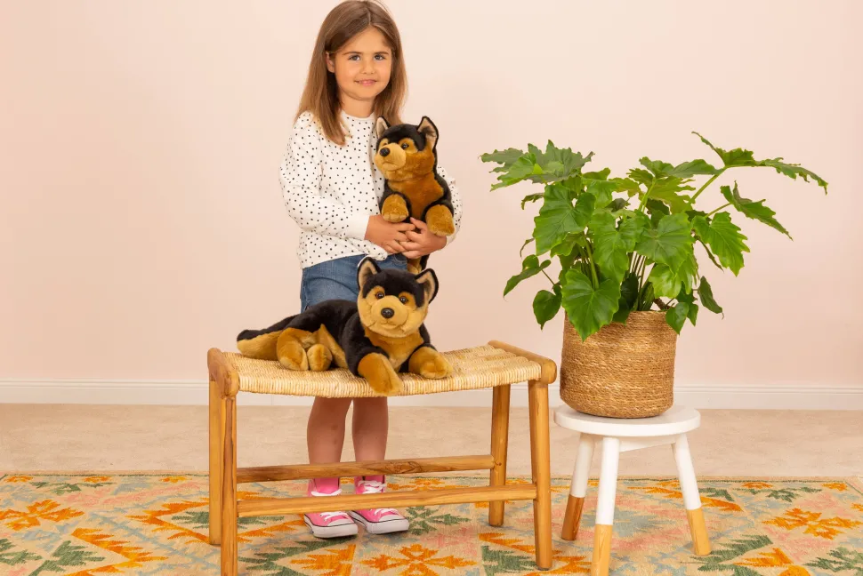 The German Shepherd plush toy is known and loved as a guard dog and will also keep an eye on the little ones in the children’s room. With its black back, brown legs, and adorable button eyes, it closely resembles the real thing. The soft fur and floppy body invites children to cuddle with it, and it also makes for a charming decoration on a dresser. Made with a feather-soft filling from 100% recycled PET, this toy is an eco-friendly choice. Vegan.