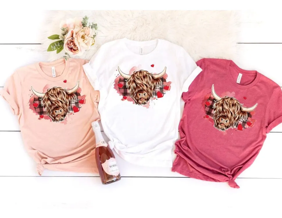 Unleash your inner cow lover with this adorable Highland Cow tee, perfect for Valentine’s day or any day! Available in multiple colors for a truly unique shirt that will make both you and your loved ones smile. These precious, fluffy bovines are irresistibly cute, making this tee a must-have addition to the cow lover’s wardrobe. MADE TO ORDER, please allow up to 2 weeks to receive your cute shirt!