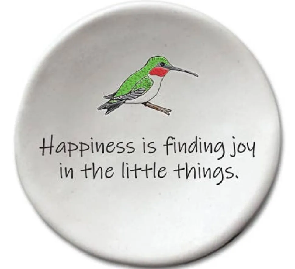“Happiness is finding joy in the little things.” Round 3.5″ ceramic dish artwork.