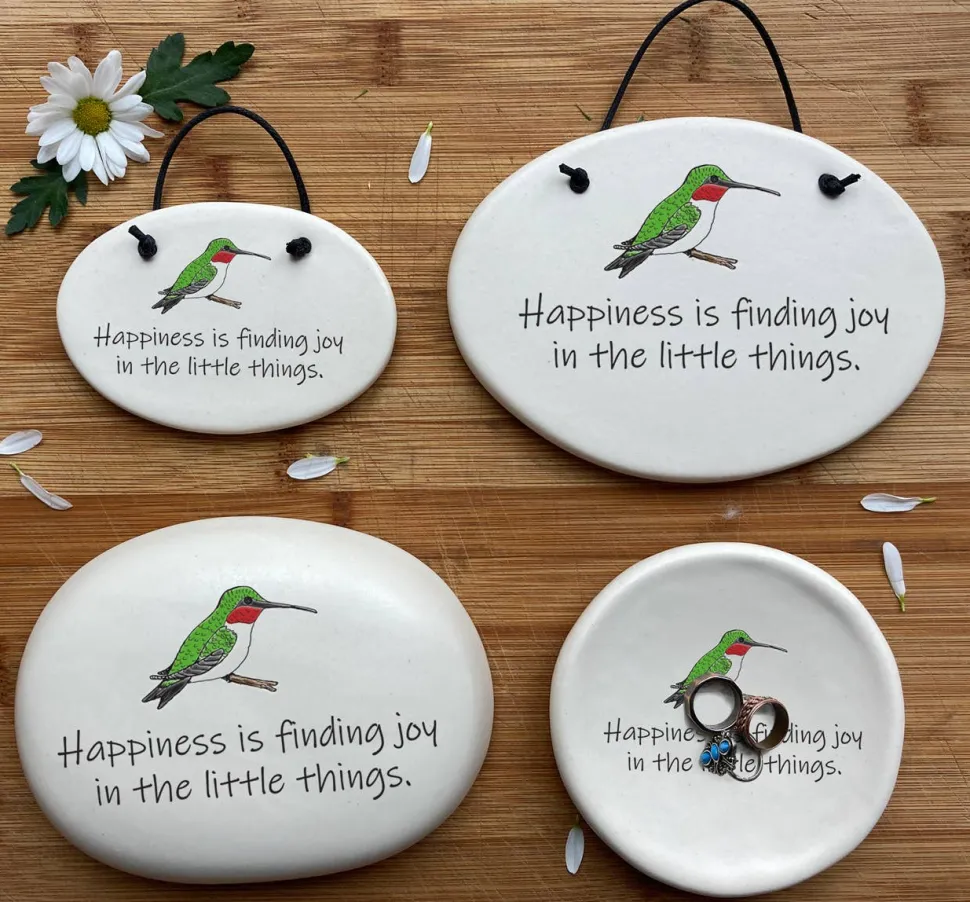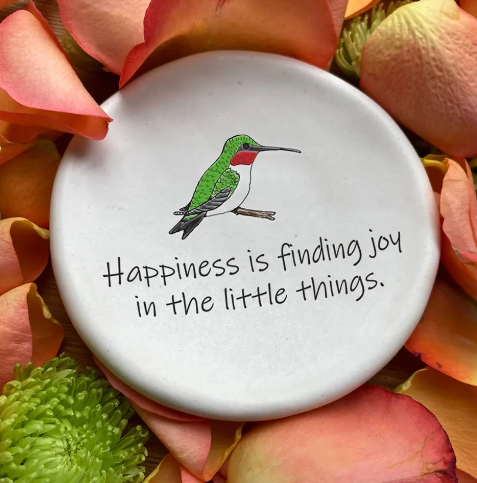 This handmade ceramic dish with a beautiful hummingbird bears the message “Happiness is finding joy in the little things.” The perfect decorative piece for any nature lover, it is both beautiful and functional, serving as a reminder to appreciate the small moments in life. Crafted with care, it adds a touch of warmth to any room. A great, inspirational gift for the hummingbird lovers!