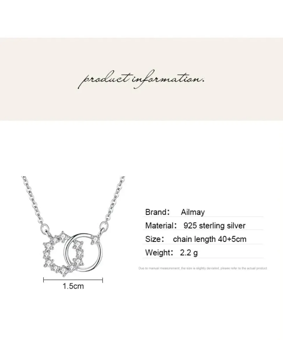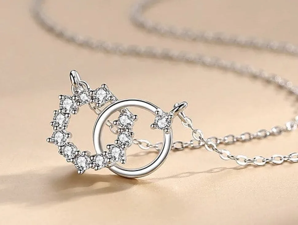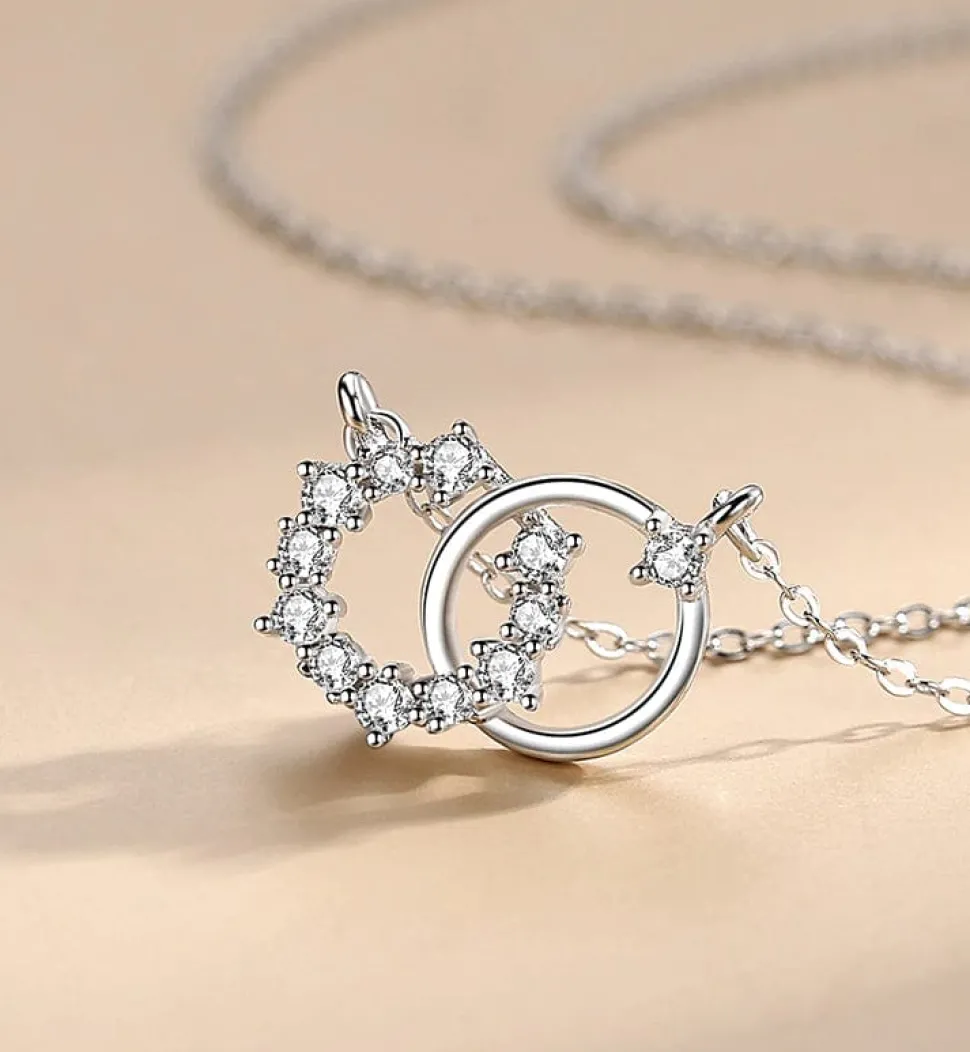 Feminine take in fine sterling silver on the popular intertwined circles necklace. Beautiful sparkling CZ make this a stunning combination of the circles for our lovers or dear friends. Dainty and feminine, this is a perfect gift for a teen or recent graduate. Gift boxed with free silver polishing cloth.