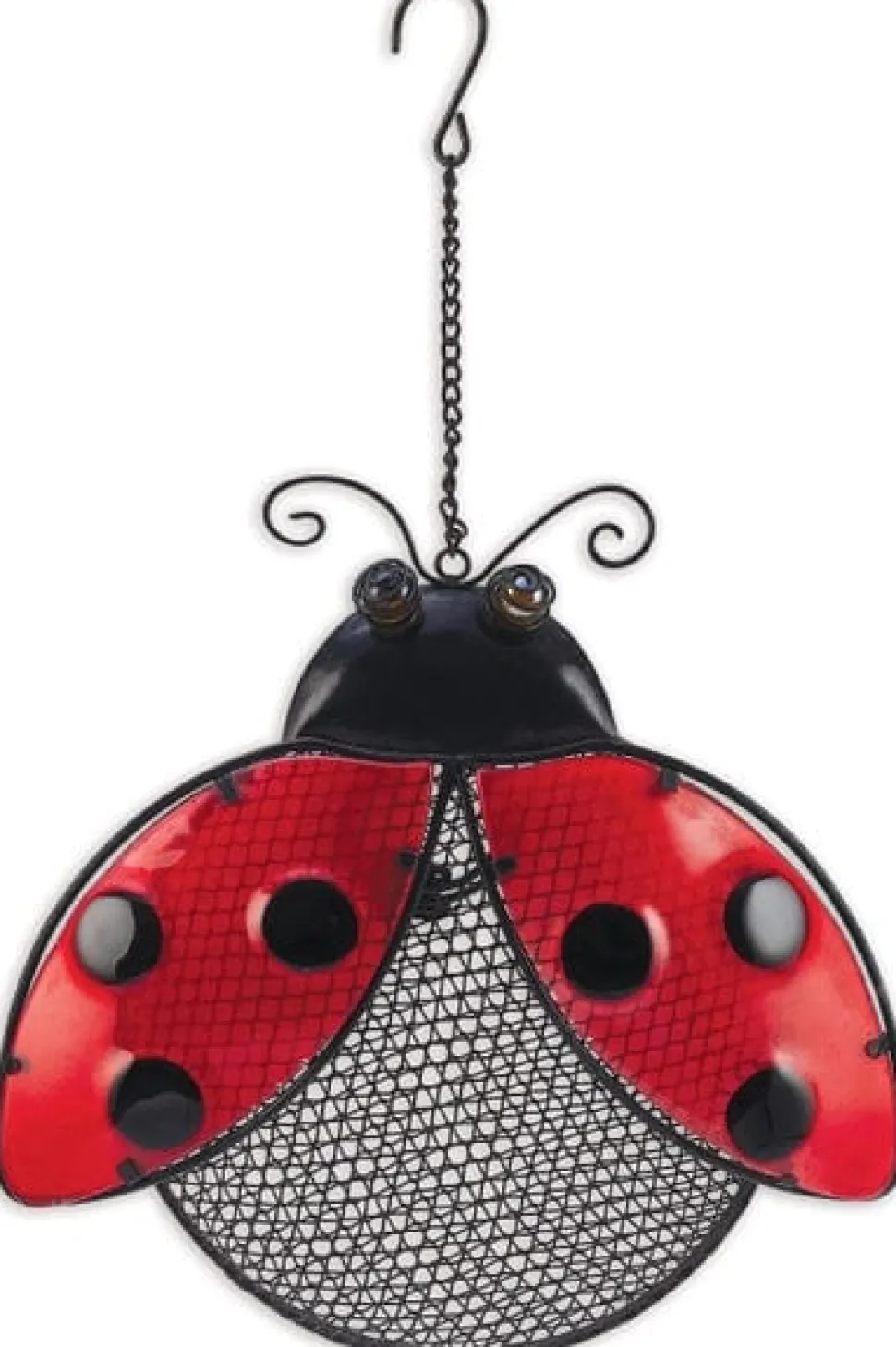 Birds can appreciate food and a little bit of fun, especially when served in such a delightful bird feeder. This lovely ladybug does a fabulous job of attracting cardinals, chickadees, finches, grosbeaks, woodpeckers, and more. Fill with black oil sunflower seed, dried mealworms, peanuts, or suet–or alternate foods for more variety. The well-ventilated mesh hopper aerates the seed, so it stays fresh, even when it rains. Easy to clean and refill. All-metal construction with red and black powder coated finish. No assembly is required.
