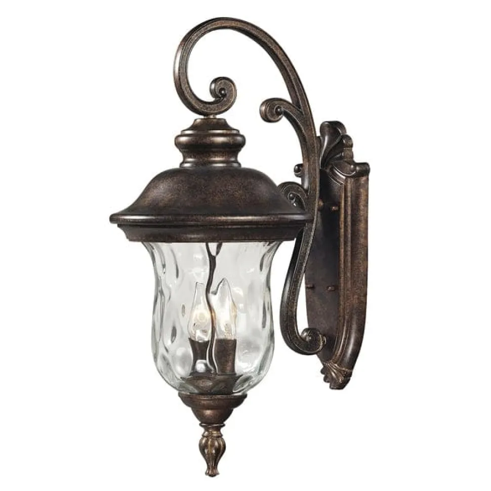 This classic outdoor design incorporates a beautifully detailed backplate and timeless arching arm that holds a flowing, blown water glass body. Constructed of durable cast aluminum and finished in regal bronze.