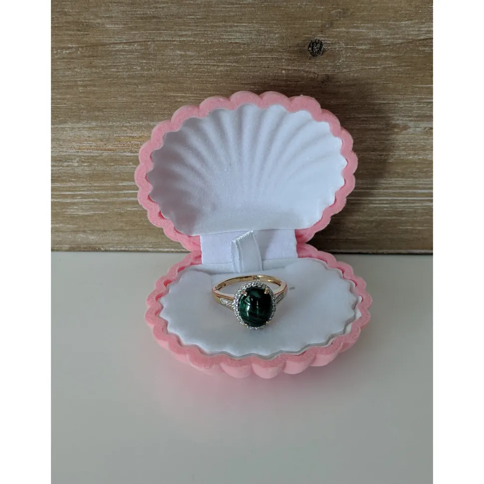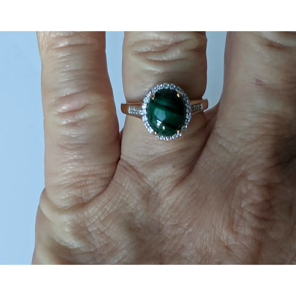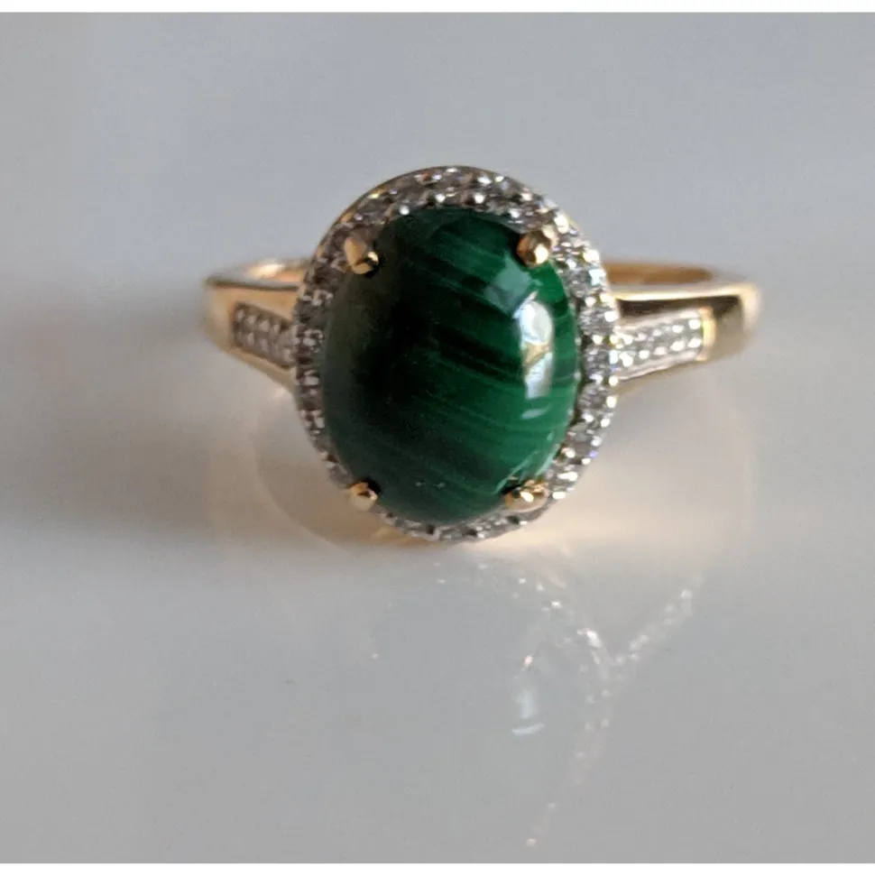 Malachite is a gorgeous deep green gemstone that you don’t see every day so if you’re looking for unusual, you just landed on it! It’s a spectacular striated deep green and the diamond halo around it make it stunning! Set in 10K solid yellow gold, this is a one of kind ring. It is a size 6.5 and can be resized. We have only one available. Comes with a GIA Appraisal ($150 value) at $756.