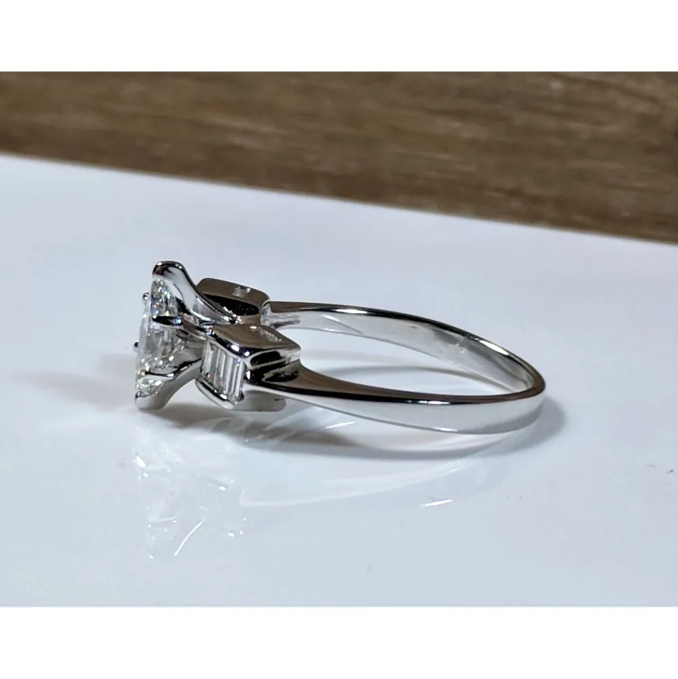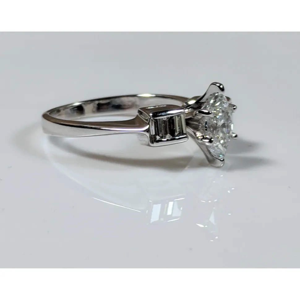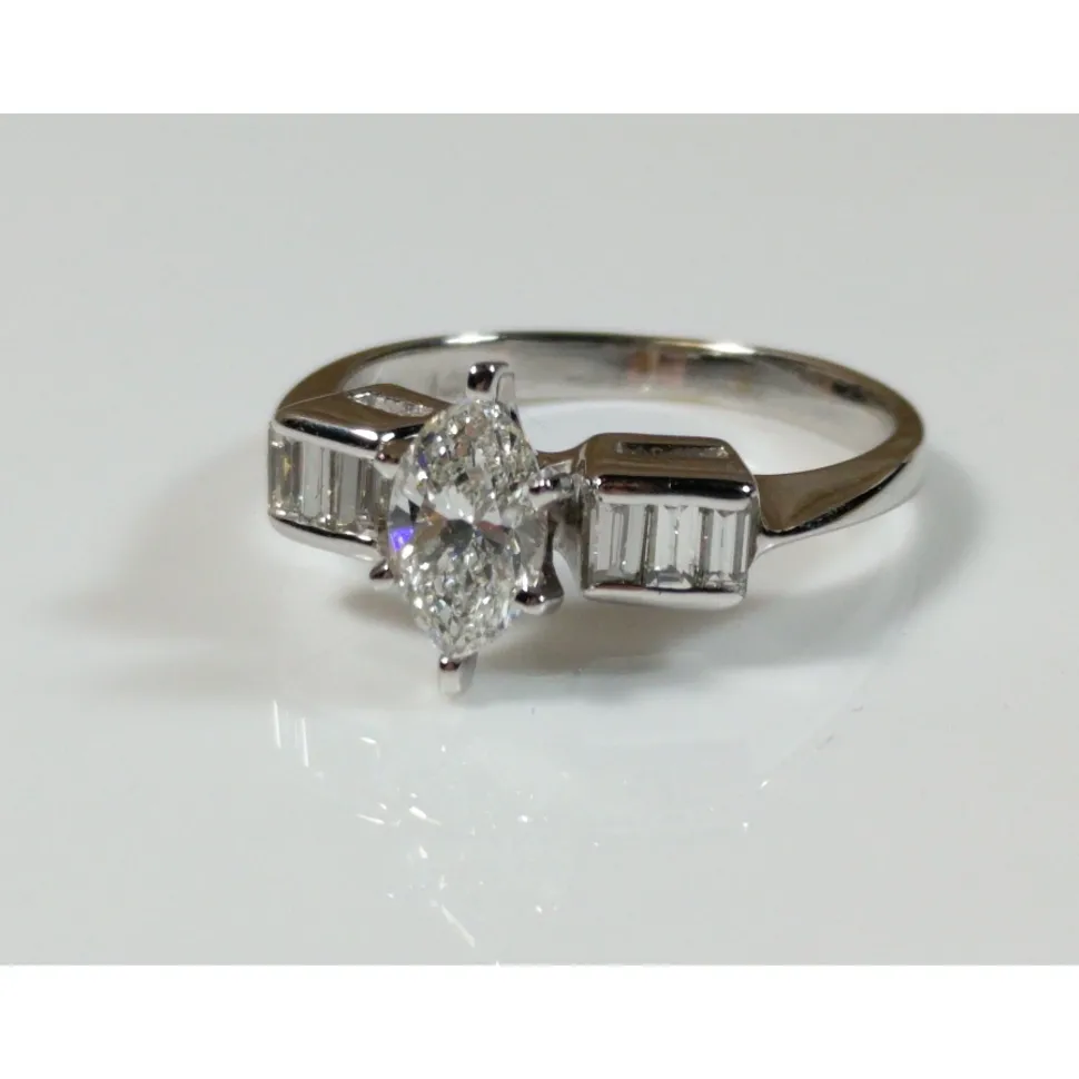 Beautiful, elegantly simple .65ct Marquise Diamond Center surrounded by .26cts of sparkling baguette diamonds. It’s a gorgeous, unique ring in 14K white gold. New and unworn, stamped 14K.