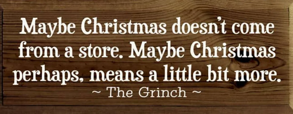 Grinch Quote Sign: Maybe Christmas doesn’t come from a store….. Inspirational solid knotty pine wood sign hand made in the USA. Size: 7” x 18″. Perfect reminder of what the Christmas season is really about from the Grinch himself.