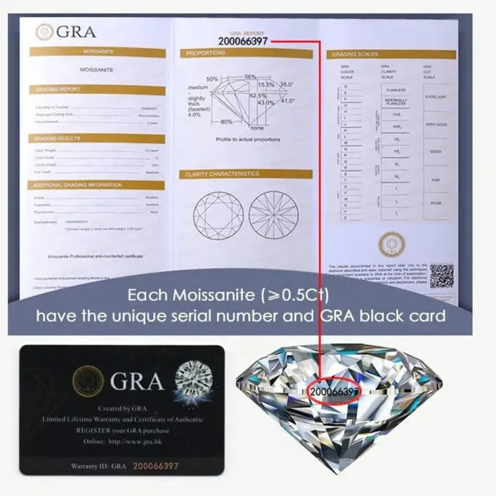 GRA Certificate for each stone measuring 1ct, D color, VVS clarity. Moissanite tests as diamond and is as hard and durable as natural diamonds but sparkles MORE than a natural diamond! Man-made without environmentally devastating mining and much easier on the wallet, Moissanite is taking the jewelry world by storm as the quality of lab-grown diamonds is diminishing and mining of diamonds is neither ethical or environmentally conscientious. You’ll be thrilled with Moissanite! It’s the perfect choice for the perfect reasons! And did we say it SPARKLES more than diamonds?!