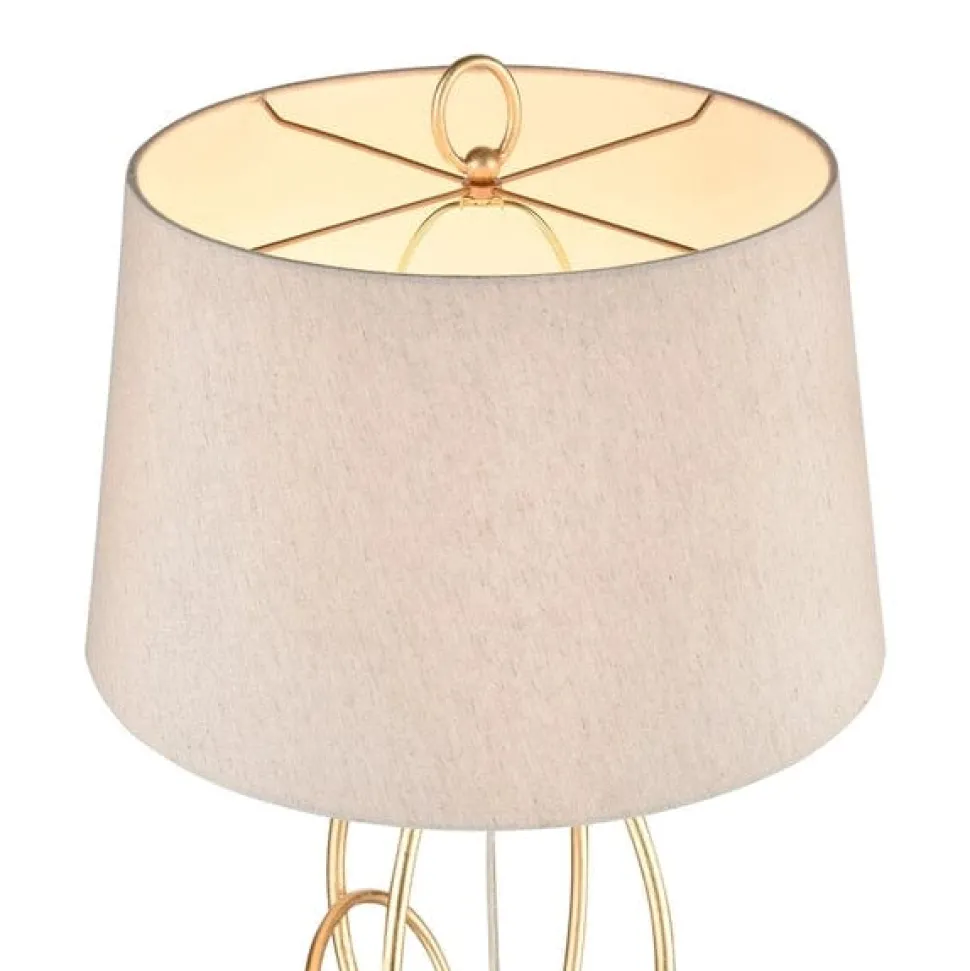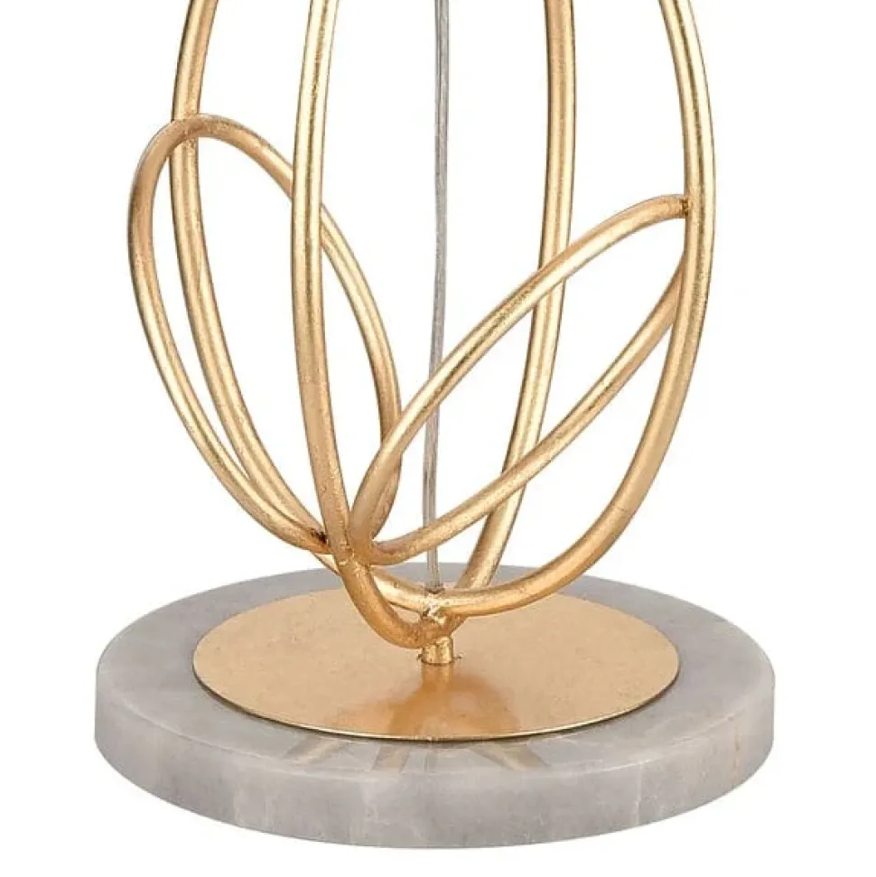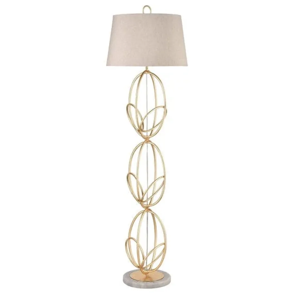 The Morley floor lamp, with triple hoop motif, takes its inspiration from updated, Scandi style, combining its structural, interlocking hoops to create a striking statement with the warm, natural tones of its oatmeal linen shade. This design features an antique, gold leaf finish and is presented on a high quality marble base.