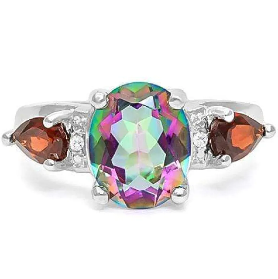 Mystic Topaz 3.2cts Flanked by Pear Shaped Garnet with Natural Diamonds in Sterling Silver setting, beautiful ring! This is such a colorful, beautiful ring, you will love it! And so affordable in sterling silver.