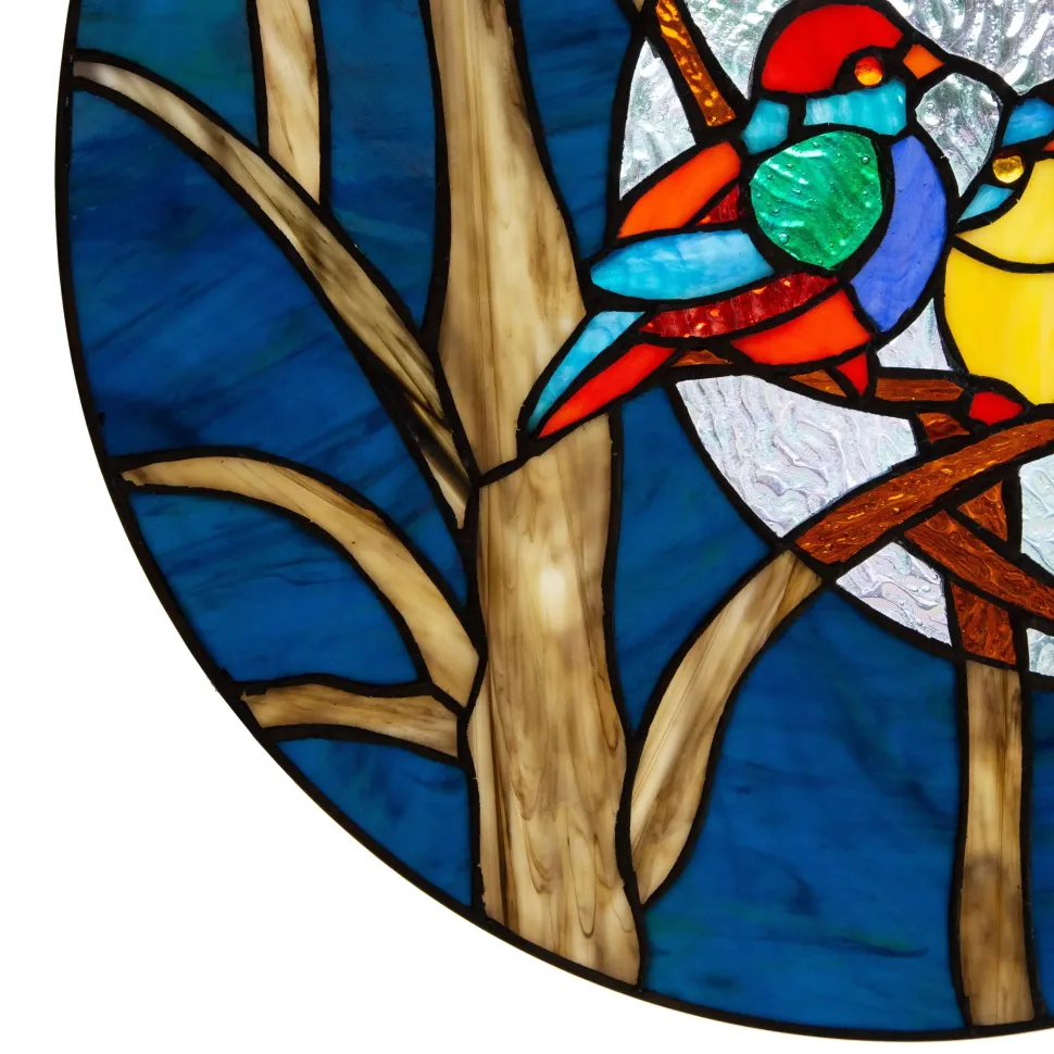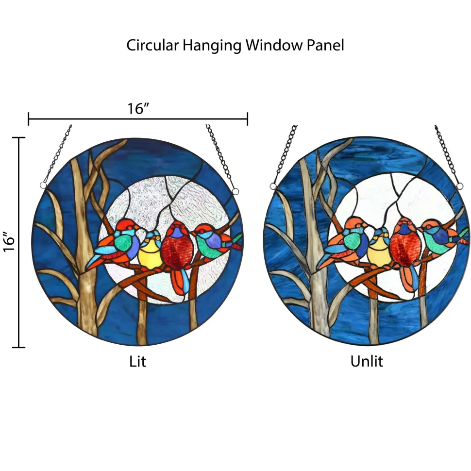 Colorful new Blue Birds in a Night Sky Stained Glass Window Panel is a perfect gift for the bird lovers in your life or a welcome addition to your home. A deep blue moonlit night sky is the perfect backdrop for these four chirping birds. This 16″H round window panel creates a moody feeling with colors of deep blue, red and browns with more than 100 pieces of hand-cut rippled and striated stained glass.