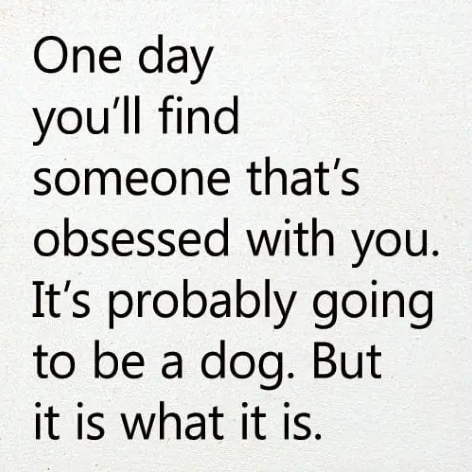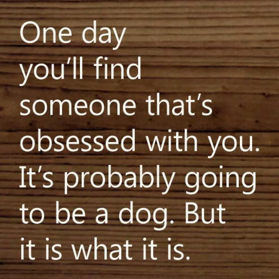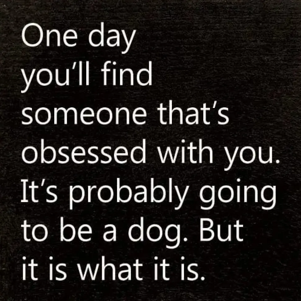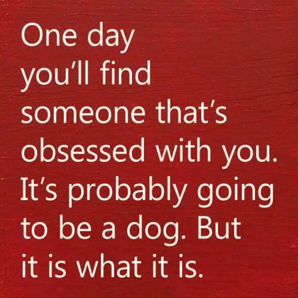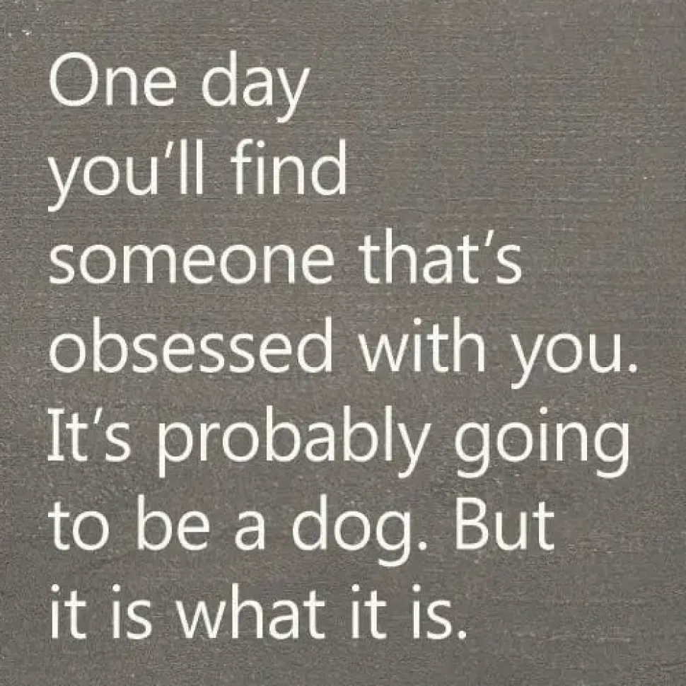 Funny solid wood sign with the saying, “One Day You’ll Find Someone That’s Obsessed With You. It’s probably going to be a dog. But it is what it is.” Funny gift for single person. Gift for teens who love dogs. Cute sign for around the home or office, wherever you need a laugh.