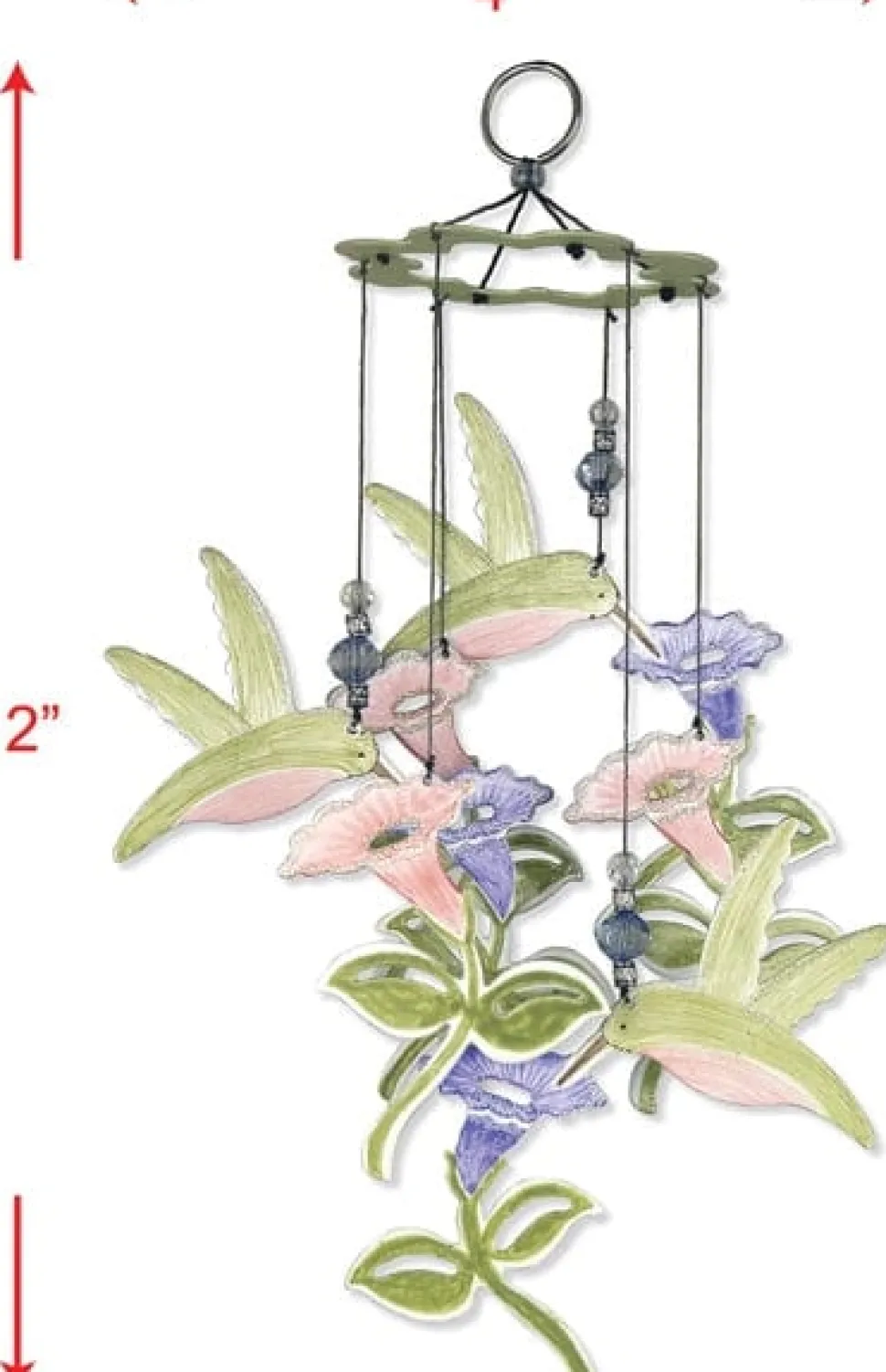 Handcrafted and hand painted metal hummingbirds and flowers, finished in beautiful watercolor pastels, dance in the breeze creating a gentle tone. Handcrafted and hand painted metal.