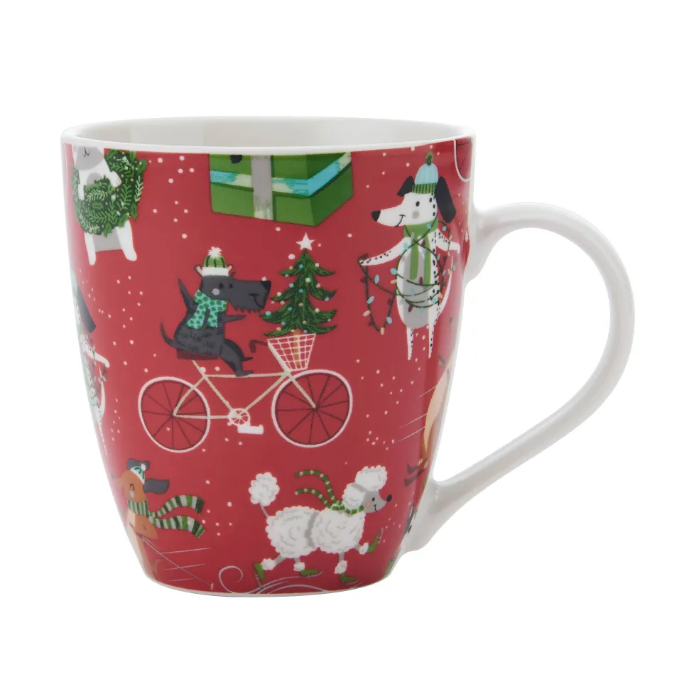- FESTIVE MUG: mug is adorned with a pattern featuring assorted celebrating dogs