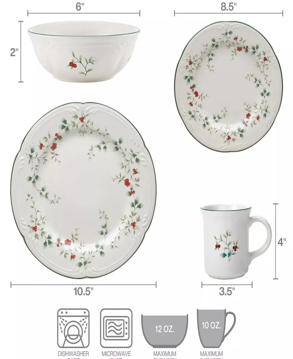 As fall turns to winter, bright holly berries make their appearance. Winterberry dinnerware by Pfaltzgraff is the holiday classic that brings this timeless motif to life in elegantly sculpted dinnerware and serveware, beautiful glassware, and joyous giftware. Featuring the festive Winterberry pattern on clean white stoneware with scalloped edges accented by a thin, pine green band, this 16-piece dinnerware set will bring holiday spirit to all your seasonal dinner gatherings for years to come. 16-piece dinnerware set, service for 4, includes 4 each of: 10-1/2 inch dinner plate, 8-1/2 inch salad plate, 2-inch tall soup/cereal bowl with a 6-inch diameter and a 12-fluid ounce capacity, and 10-fluid ounce mug. Microwave and dishwasher safe.
