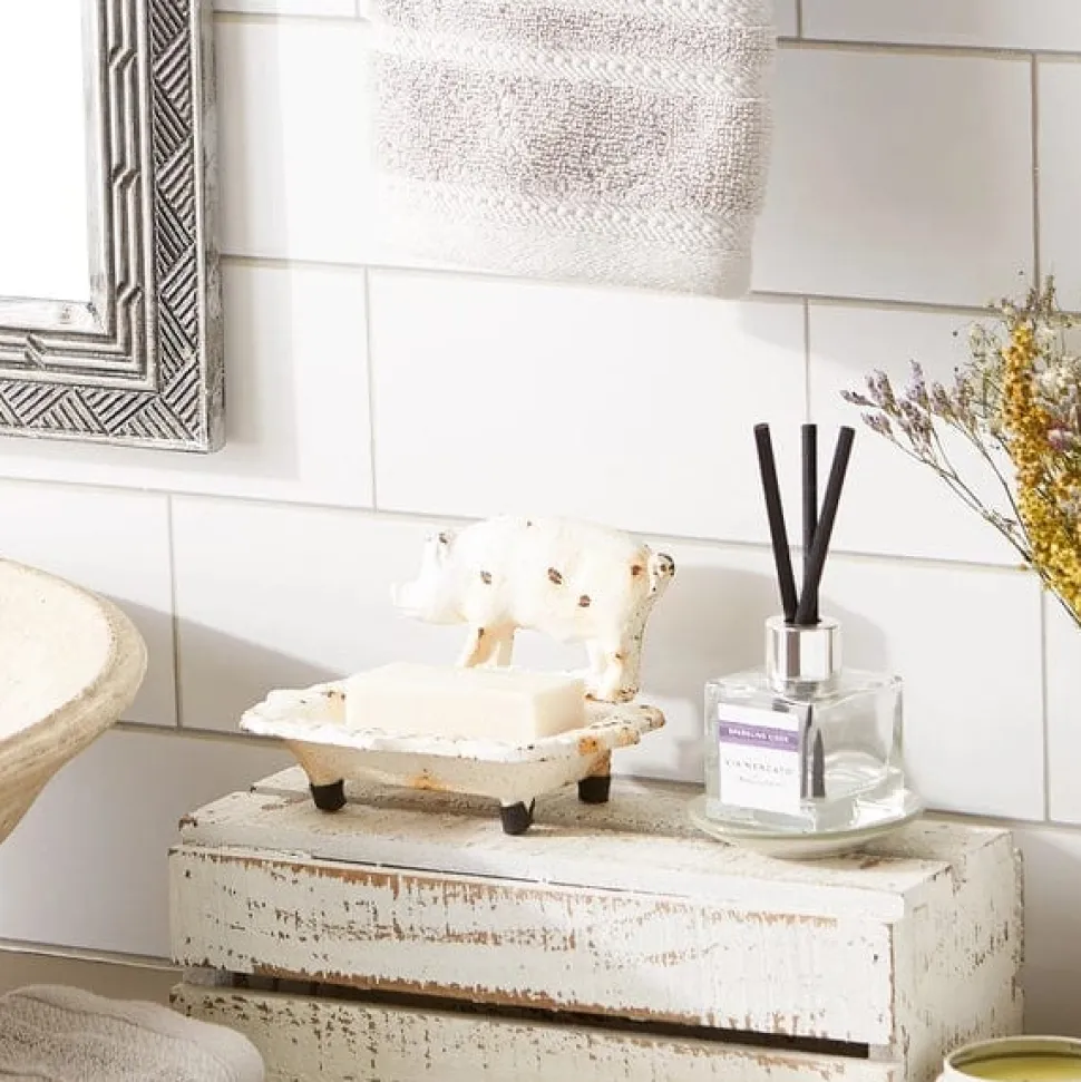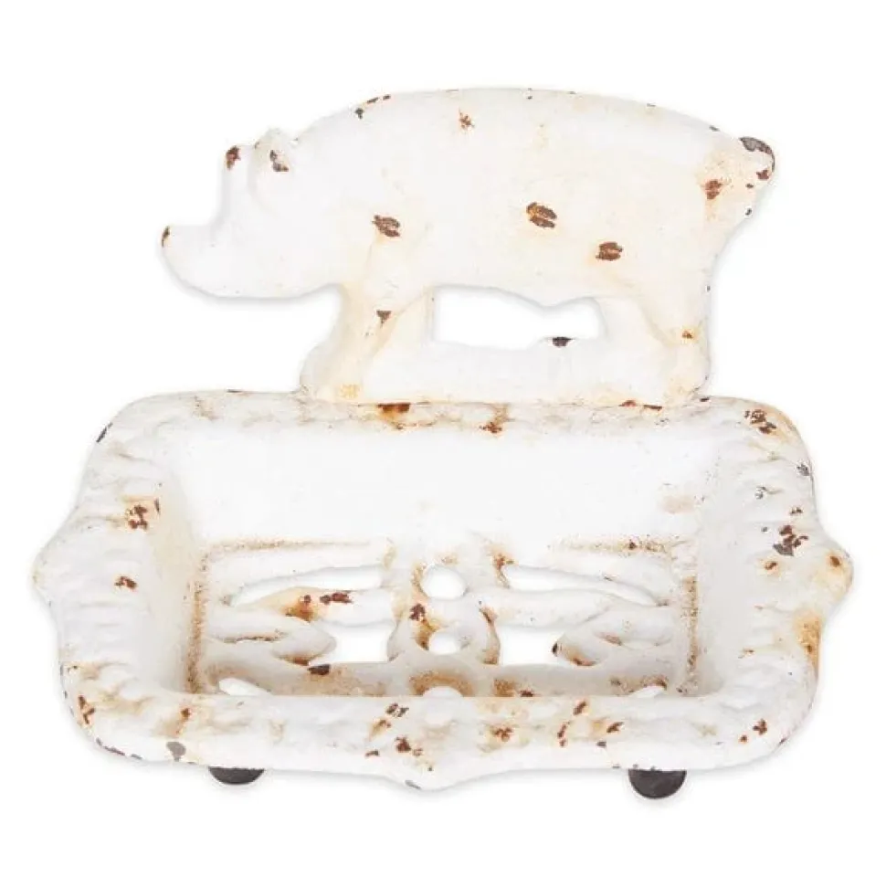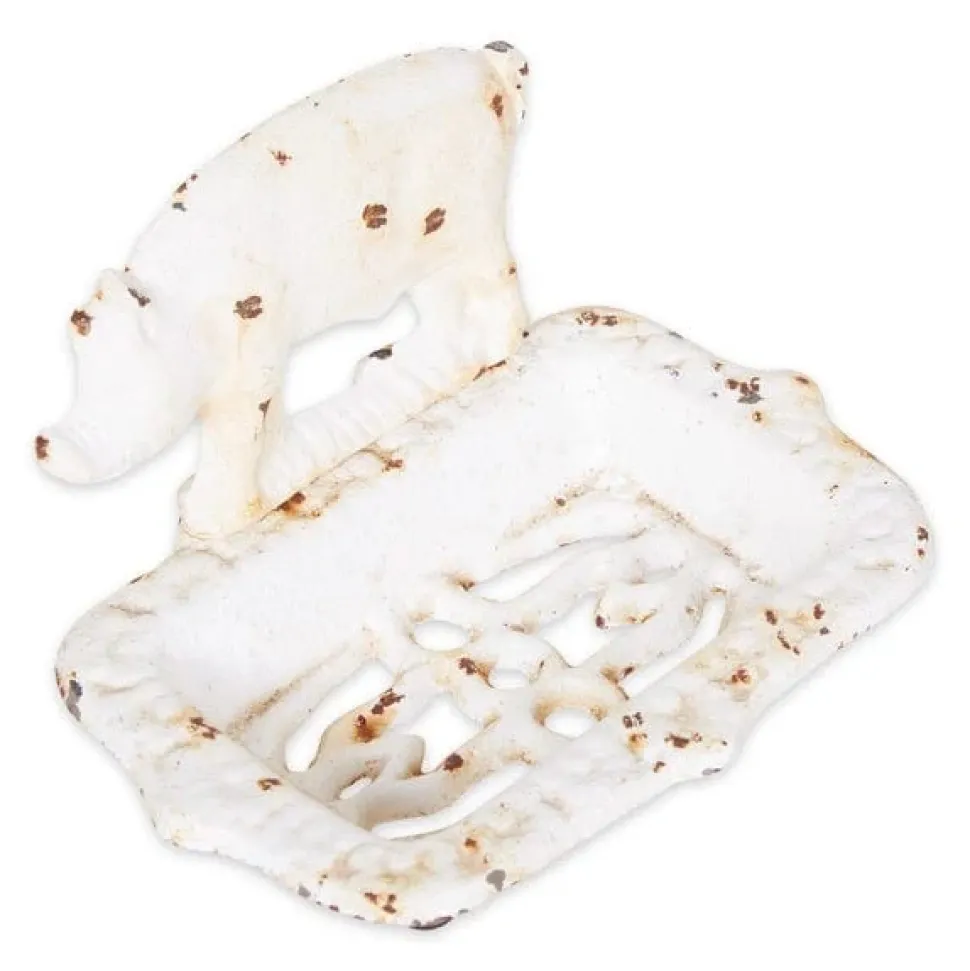 Soap dish weighs 1.3 lbs. and measures 5.7×4.3×3.7 inches. Made of cast iron, will fit right in with your kitchen, bath or laundry room décor. Designed with holes to let your soap bar dry out and preventing soggy soap. This charming farm pig soap dish is designed with a distressed white finish, add charm to your space. To clean, wipe with a damp cloth as needed. Keep your soap from getting soggy with this adorable cast iron bathtub soap holder.