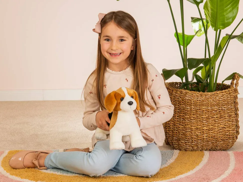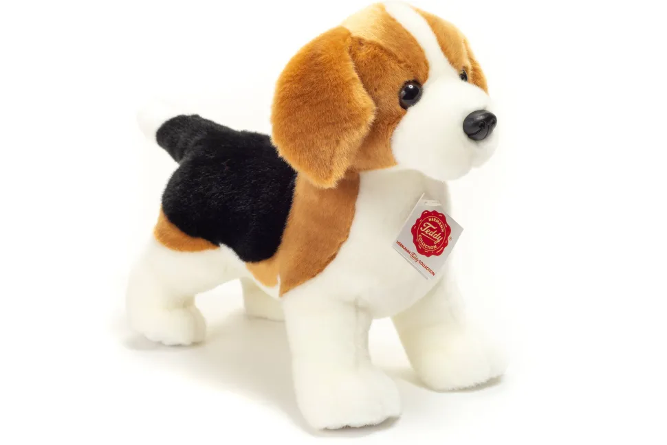 This beagle puppy from Teddy Hermann Collection stands at 26 cm tall and promises a charming cuddling experience, thanks to its adorably realistic appearance. Its three-colored, soft coat, cute little nose, and sweet floppy ears will win over any dog lover. This is the large size of the Teddy Hermann plush beagles. Each one is beautifully crafted and a finely made stuffed replica of the real thing!